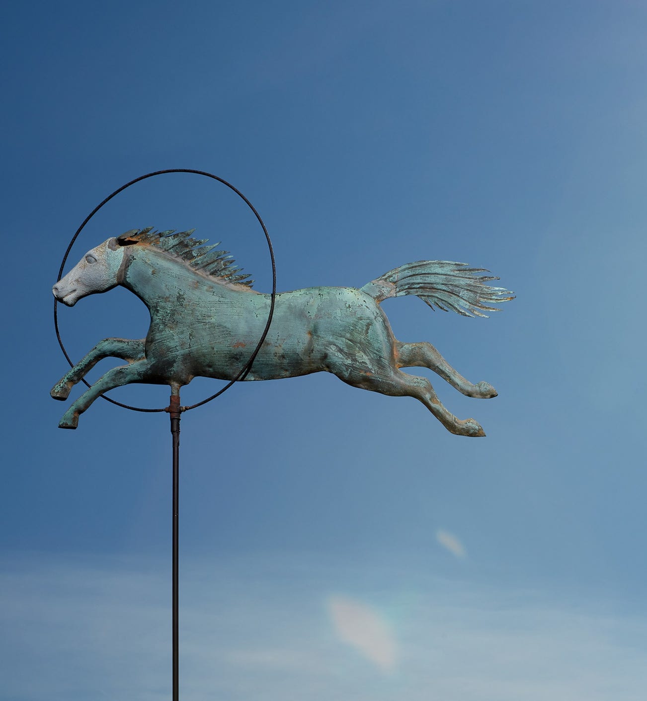 A full-bodied molded copper and zinc “Horse and Hoop” weathervane
