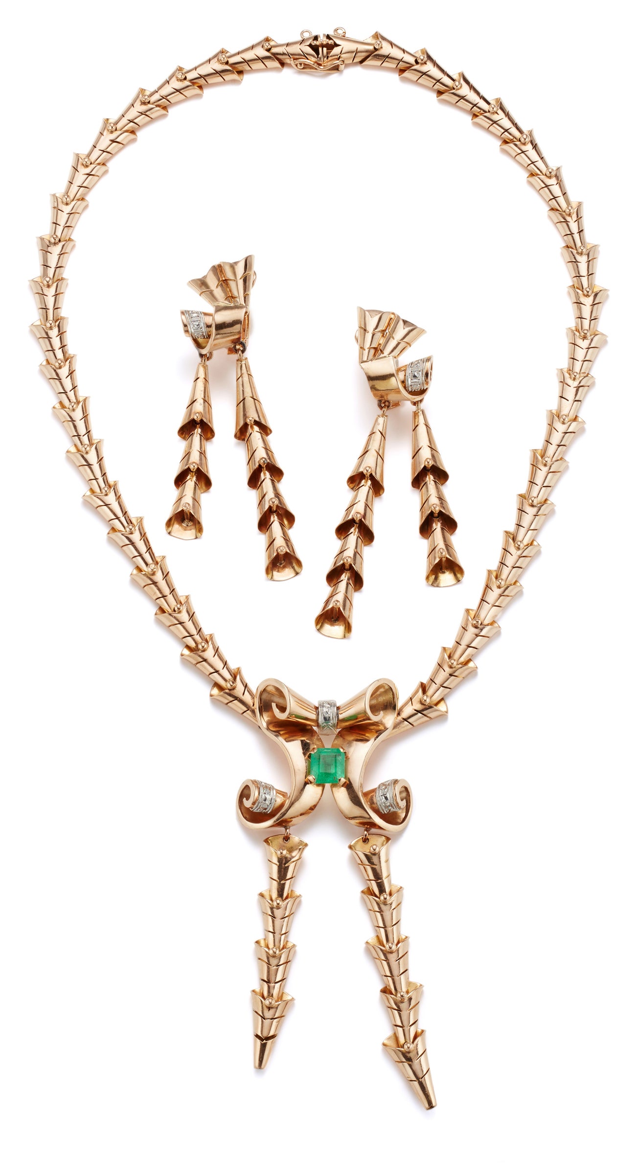 A Retro Emerald and Gold Necklace and A Pair of Gold Earrings