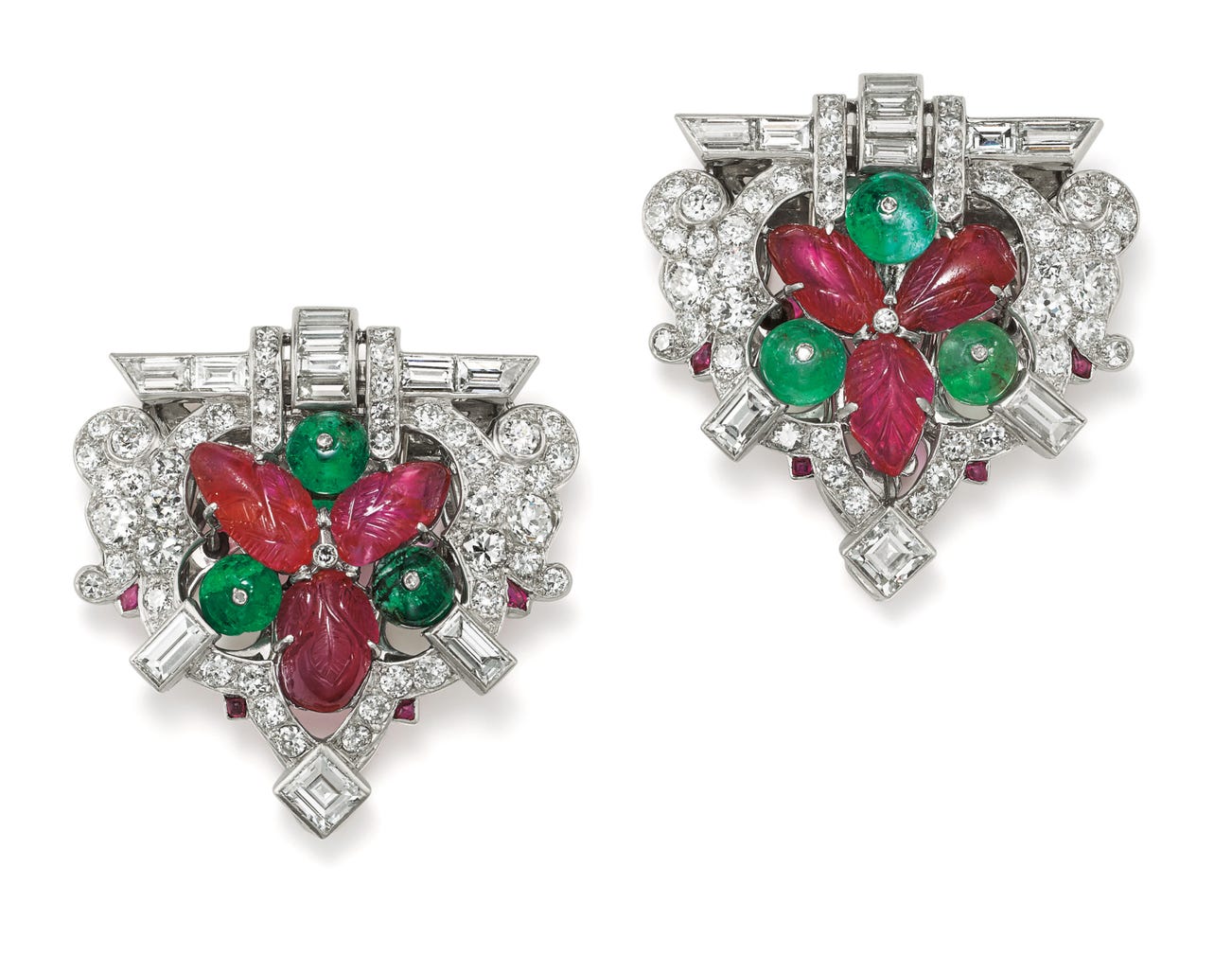 A Pair of Art Deco Diamond, Ruby, Emerald, Platinum and Gold Clips