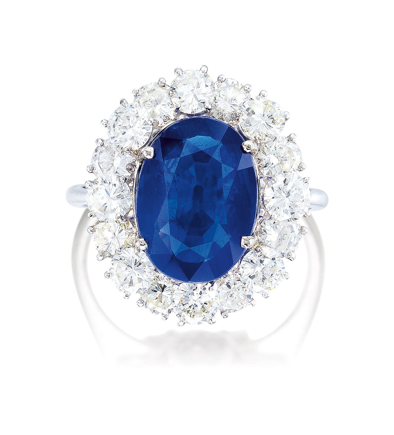 One oval sapphire, 5.14 caratsBrilliant-cut diamonds in the surround, totalling approximately 2.20 carats18 karat white gold(5.14-carat Sapphire)