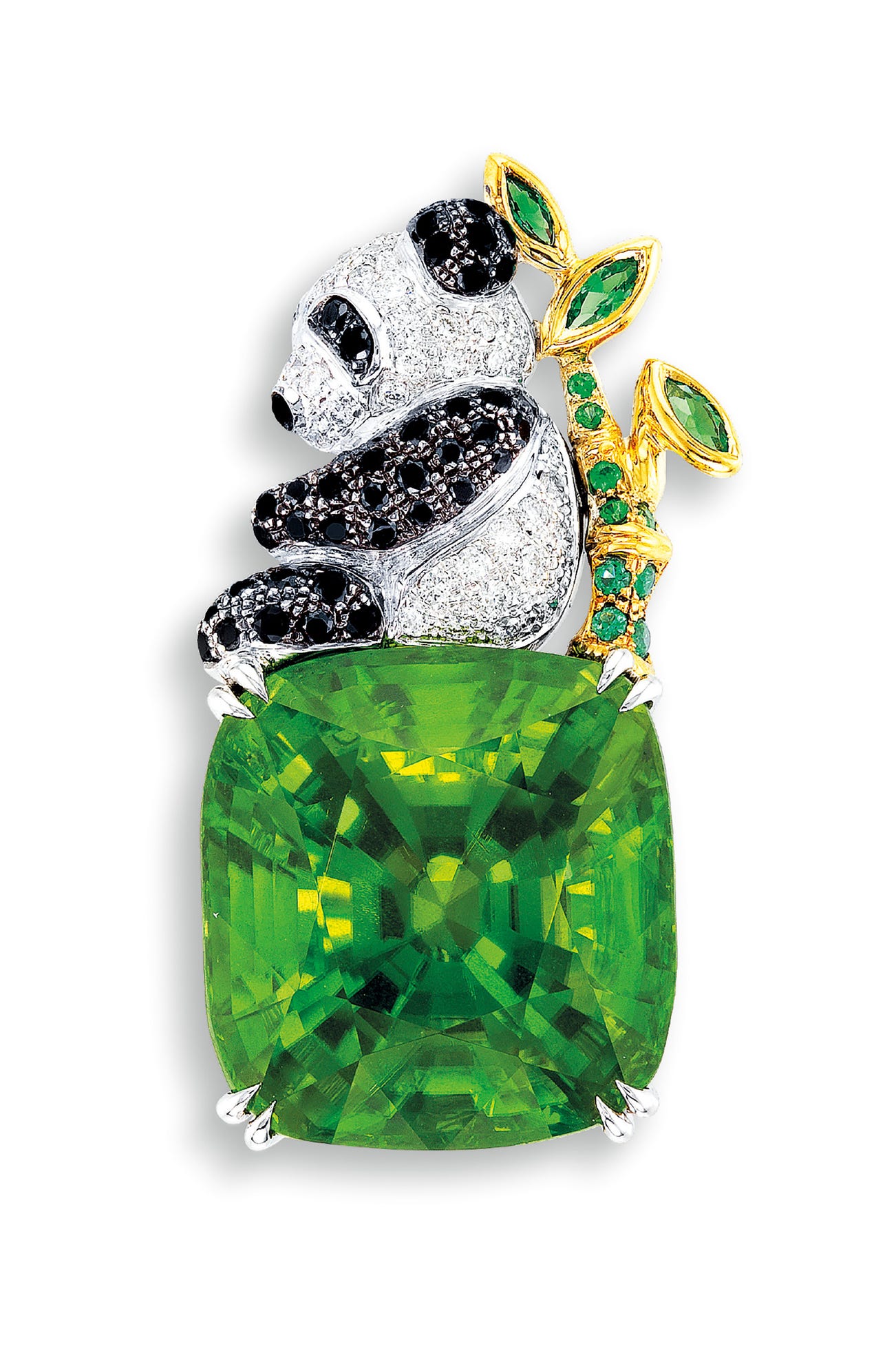 A cushion-shaped peridot, 33.40 carats'Panda' set with colourless and black diamonds, with tsavorite garnet-set 'bamboo'18 karat white, yellow and blackened gold(33.40-carat Peridot) <em>A gem report, Burma, no indication of thermal treatment.</em>