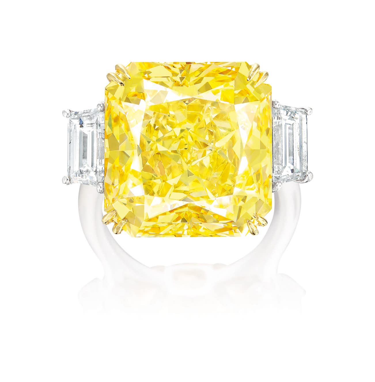 One cut-cornered modified brilliant-cut Fancy Vivid Yellow diamond, 16.08 caratsFlanked by two trapezoid diamonds, totalling approximately 1.00 carat, with tiny colourless and yellow diamonds on basket18 karat white and yellow gold(16.08-carat Diamond)