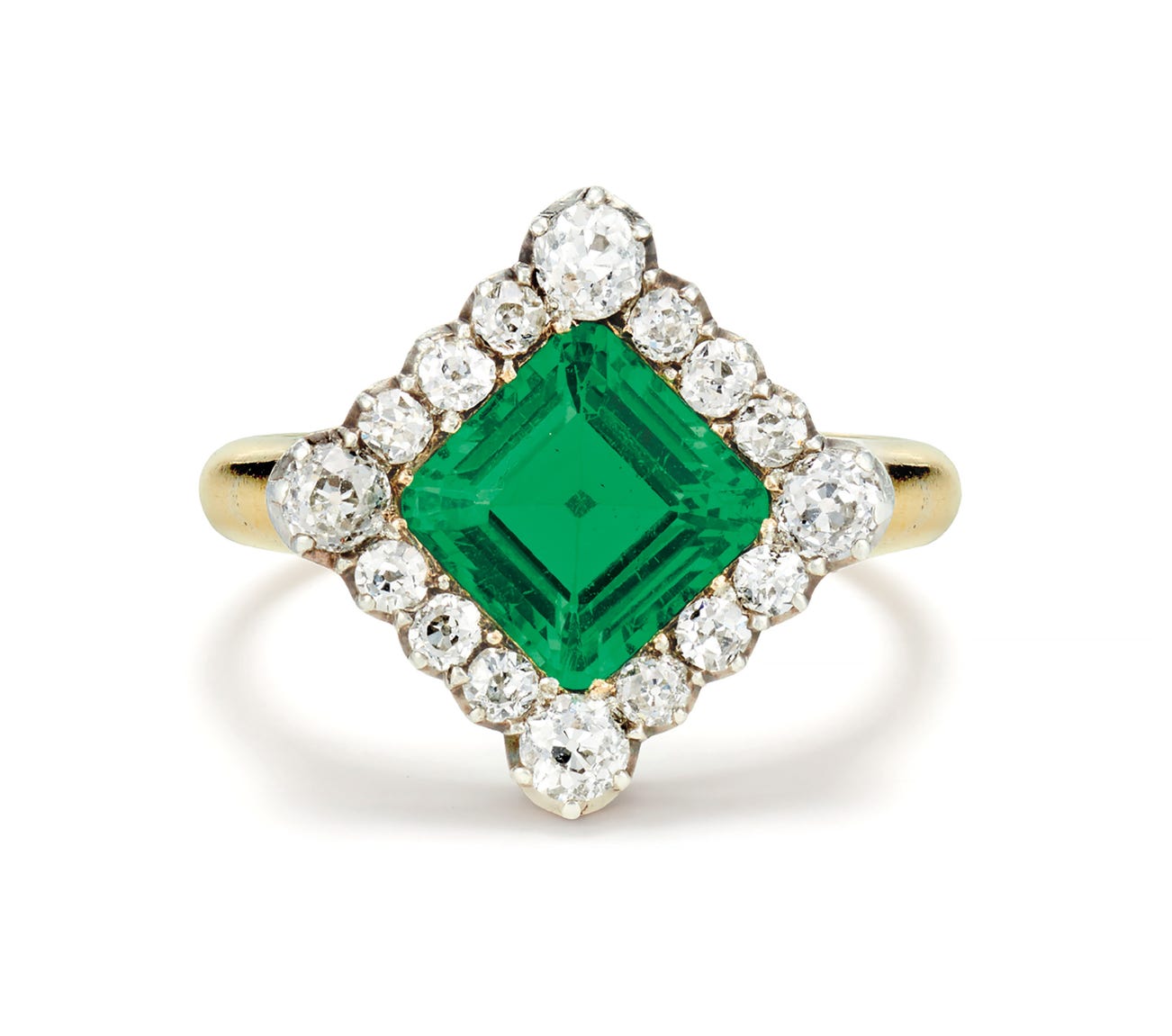 A Fine Antique Emerald, Diamond, Gold and Silver-Topped Gold Ring