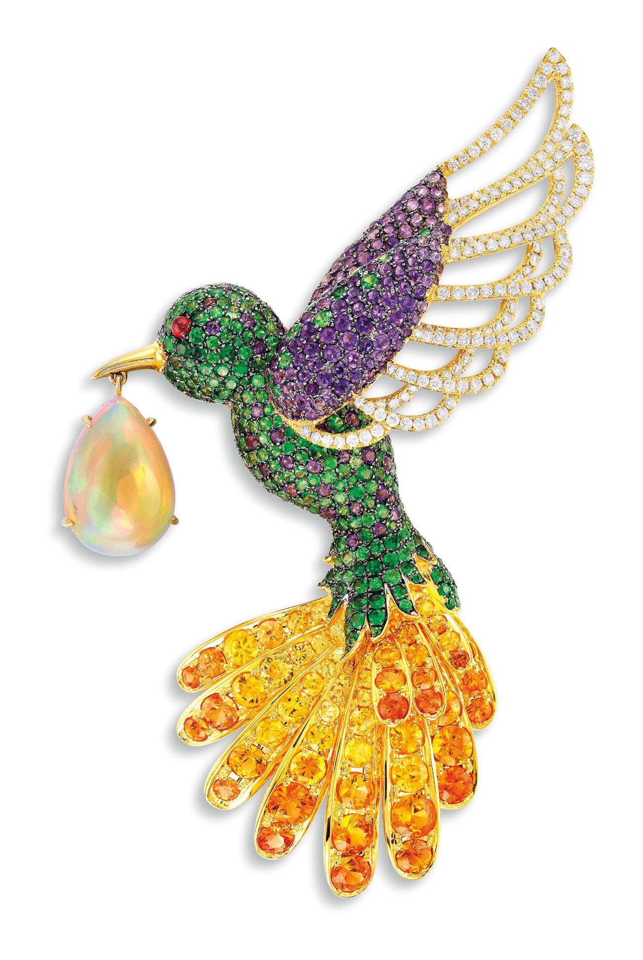 Body and wings set with amethysts and tsavorite garnets, further embellished with brilliant-cut diamondsYellow sapphires on plume, totalling approximately 10.45 caratsSuspending a pear-shaped cabochon opal18 karat yellow gold