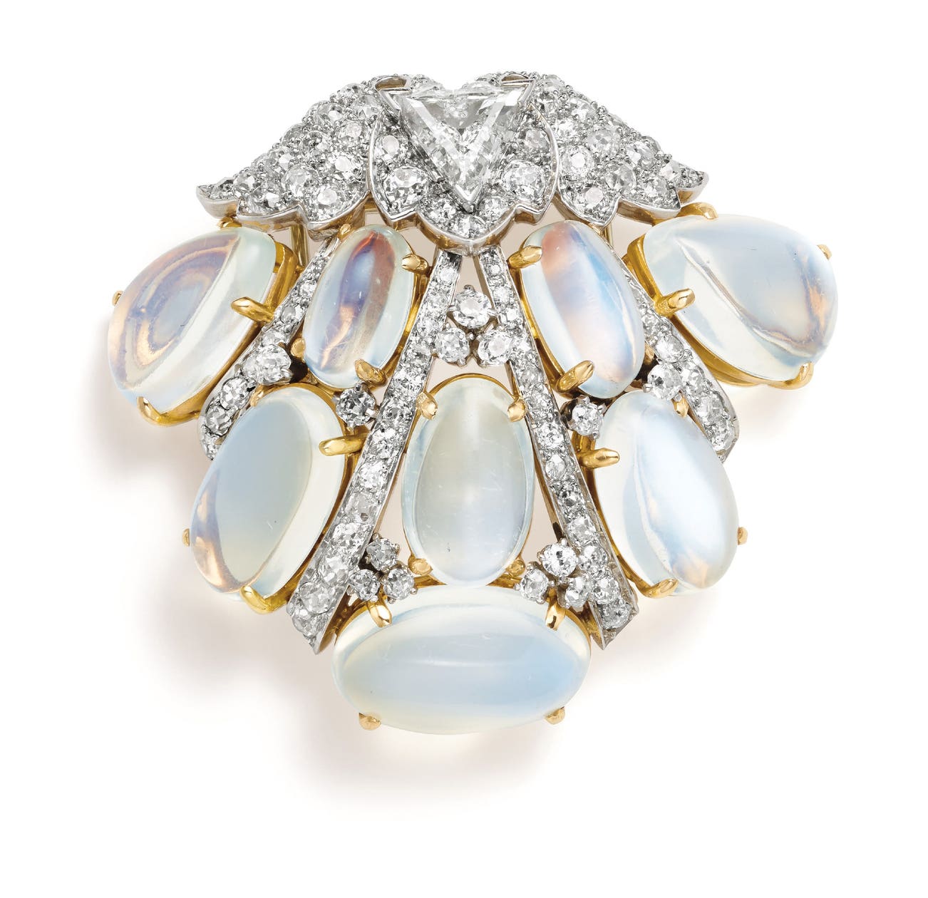 A Diamond, Moonstone, Platinum and Gold Brooch