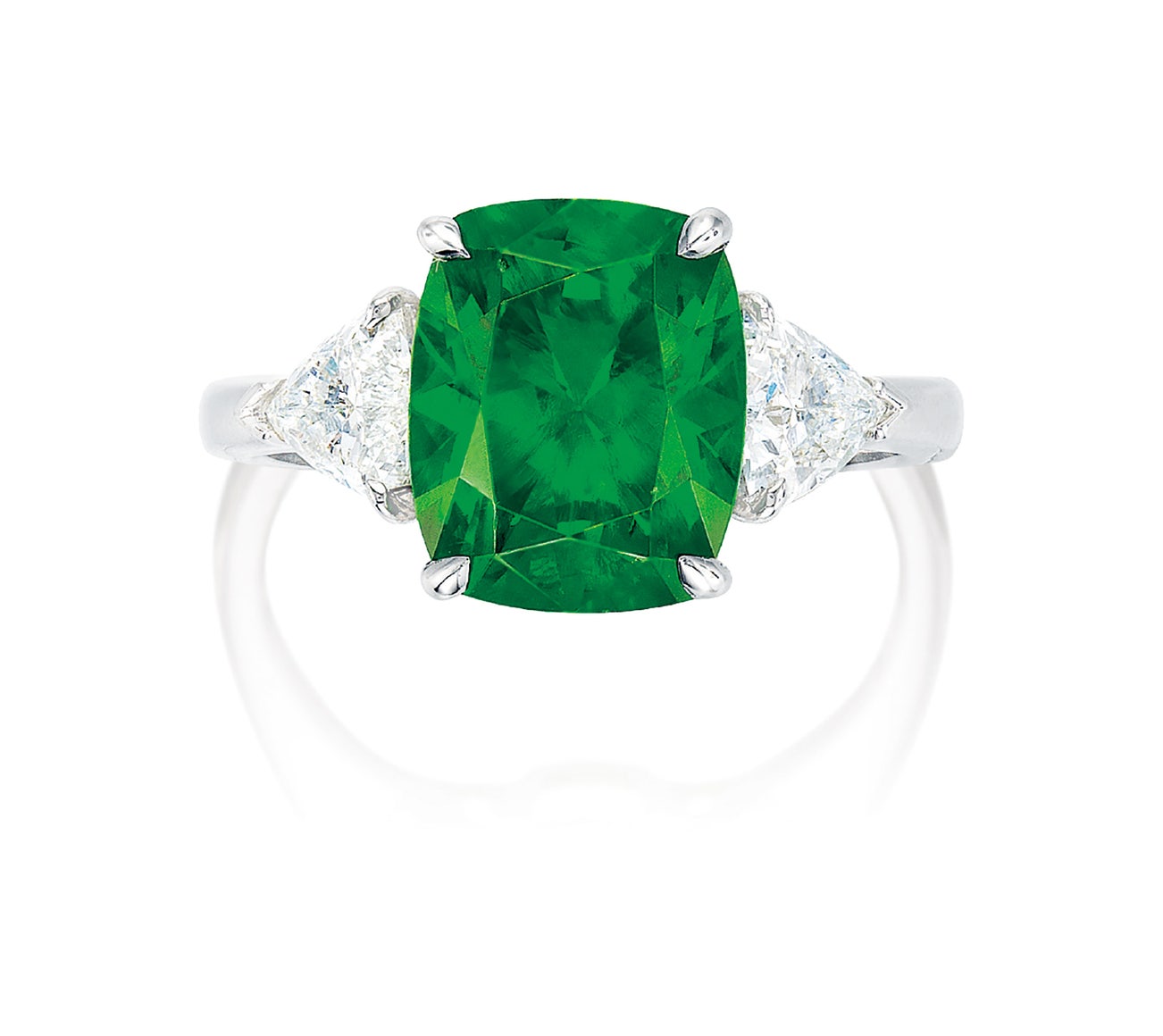 One cushion-shaped demantoid garnet, 4.81 caratsFlanked by two trilliant-cut diamondsPlatinum(4.81-carat Demantoid Garnet)