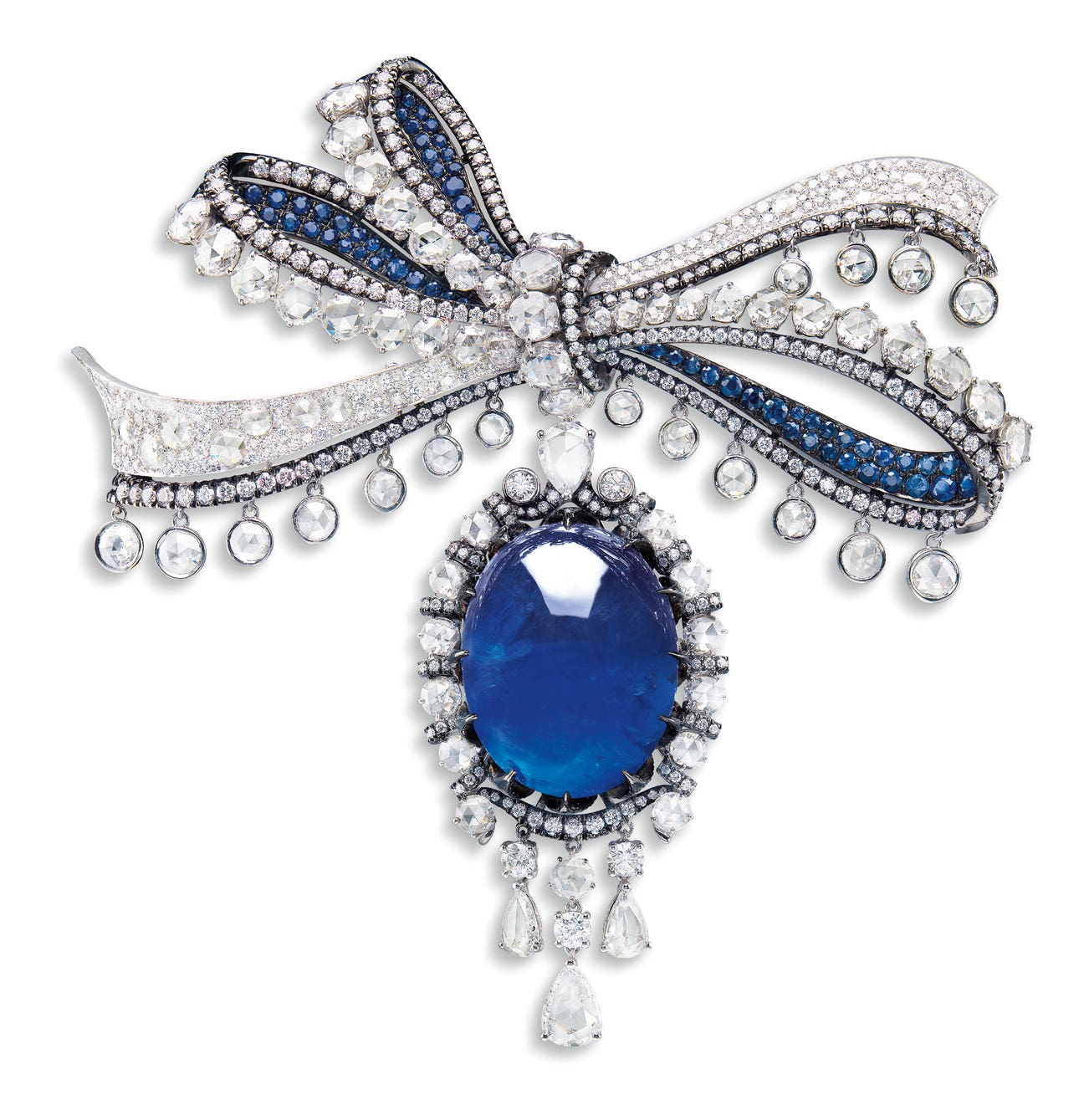 One oval cabochon sapphire, 75.95 caratsPendant surround and ribbon-bow set with brilliant- and rose-cut diamonds, together approximately 21.40 caratsRibbon-bow further highlighted with tiny sapphires, totalling approximately 2.30 carats18 karat white and blackened gold(75.95-carat Sapphire)