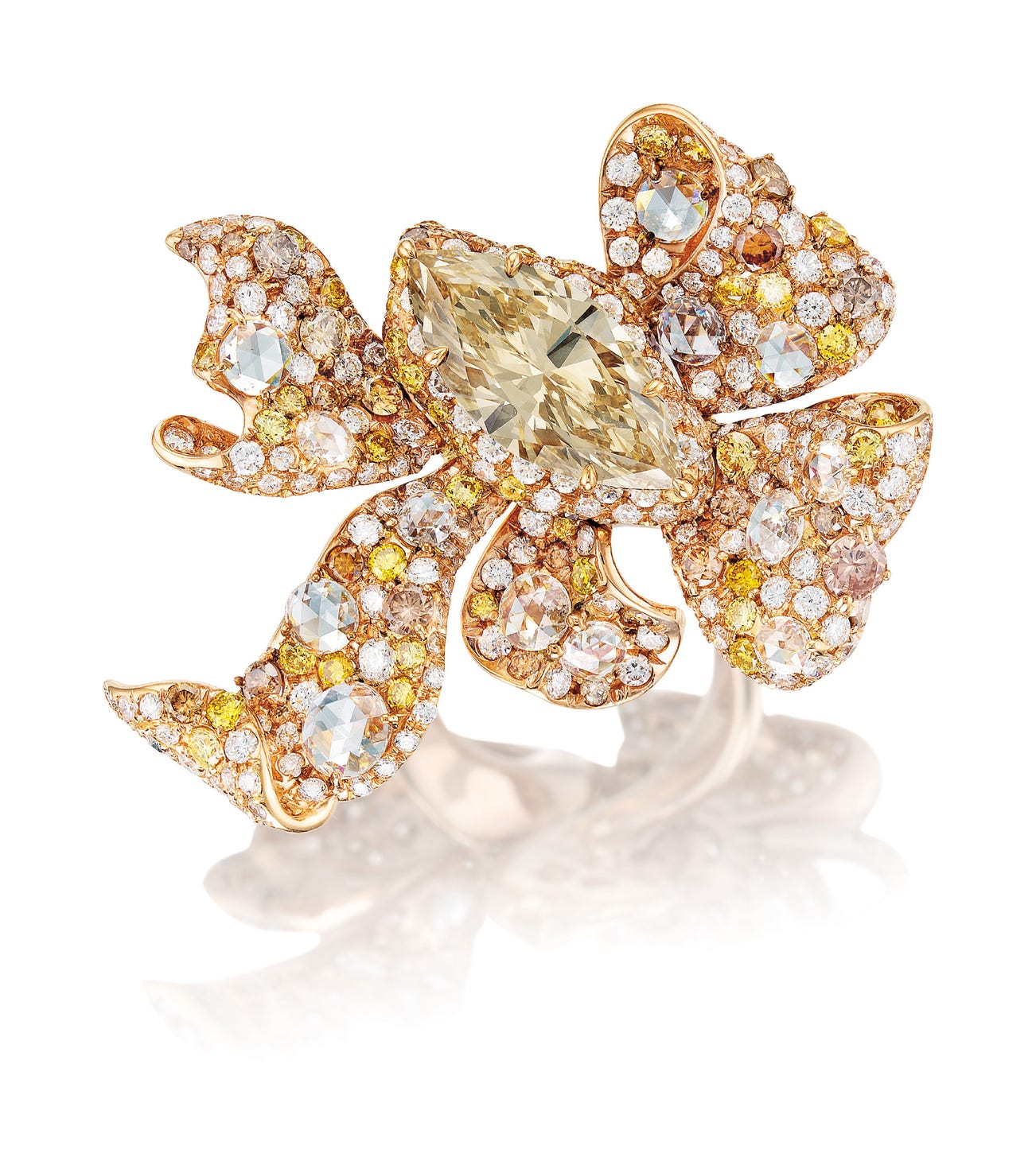One marquise-shaped Fancy Light Yellowish Brown diamond, 4.18 caratsRibbon-bow design set with rose-cut diamonds and coloured diamonds throughout, together approximately 6.70 carats18 karat pink gold(4.81-carat Diamond)