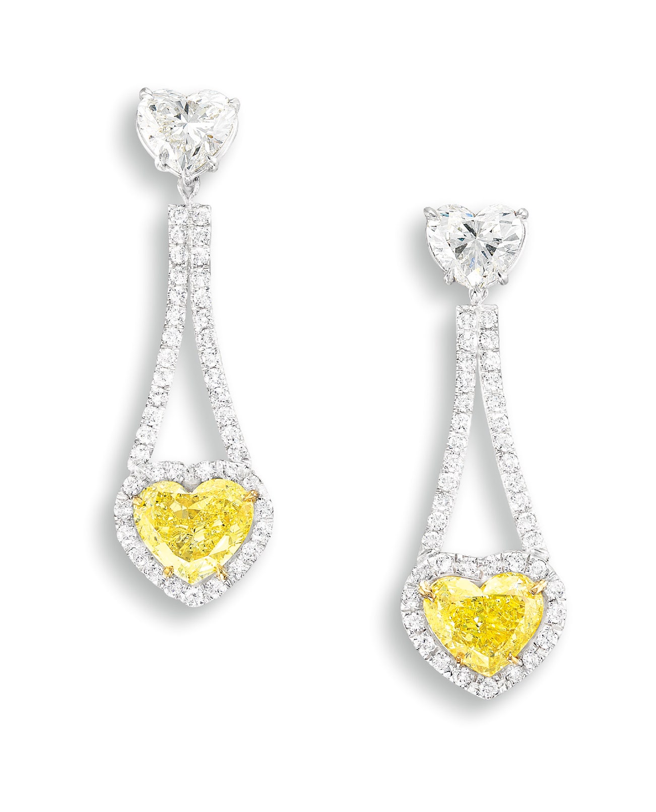 Two heart-shaped Fancy Intense Yellow and Fancy Yellow diamonds, 0.94 and 1.03 carats respectivelyTwo heart-shaped diamonds in the surmount, 0.69 and 0.60 carat respectivelyBrilliant-cut diamond links and surroundsPlatinum and 18 karat yellow gold(0.94-carat Diamond) <em>GIA report, numbered 5111077919, dated 25 September 2009, Fancy Intense Yellow colour, VS1 clarity. </em>