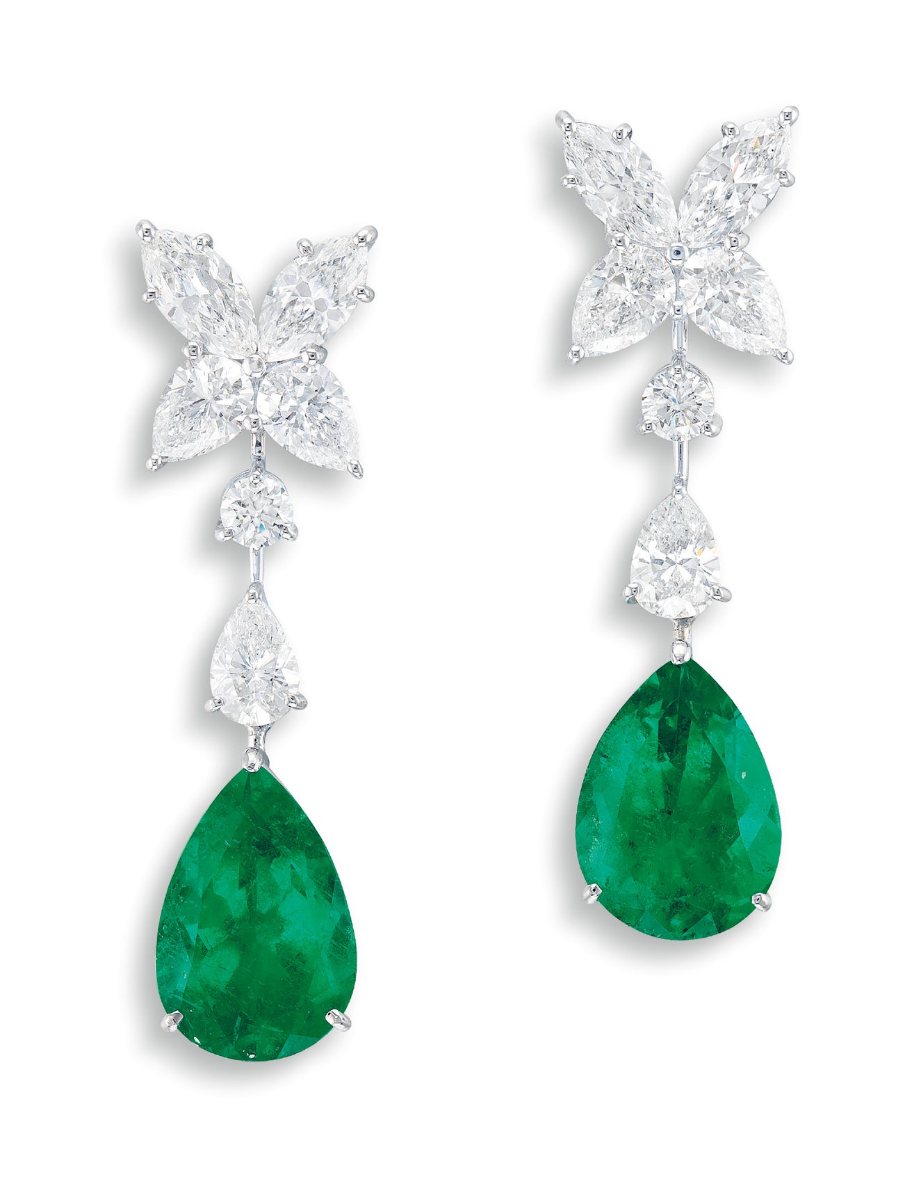Two pear-shaped emeralds, 5.53 and 5.40 caratsBrilliant-cut, pear- and marquise-shaped diamonds in the surmount, totalling approximately 5.50 caratsPlatinum(5.53- and 5.40-carat Emeralds)