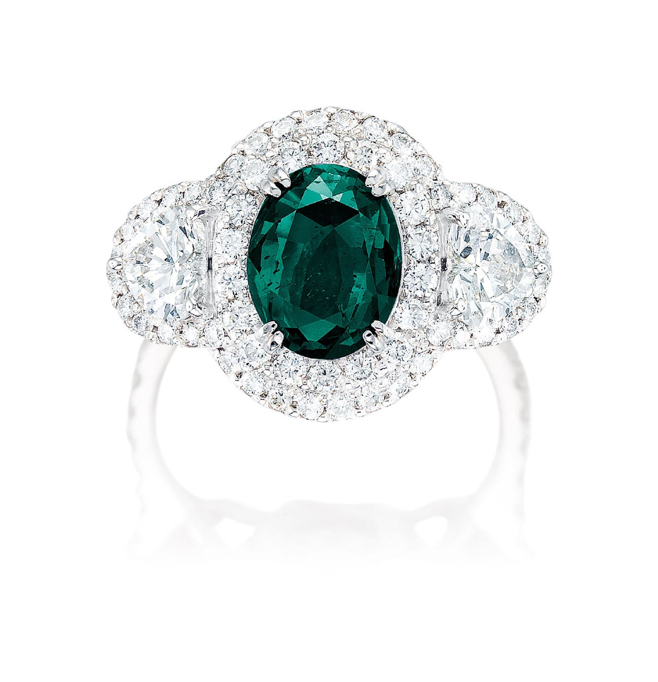One oval alexandrite chrysoberyl, 2.80 caratsFlanked by two heart-shaped diamonds and brilliant-cut diamonds in the surround, totalling approximately 1.00 caratPlatinum(2.80-carat Alexandrite)