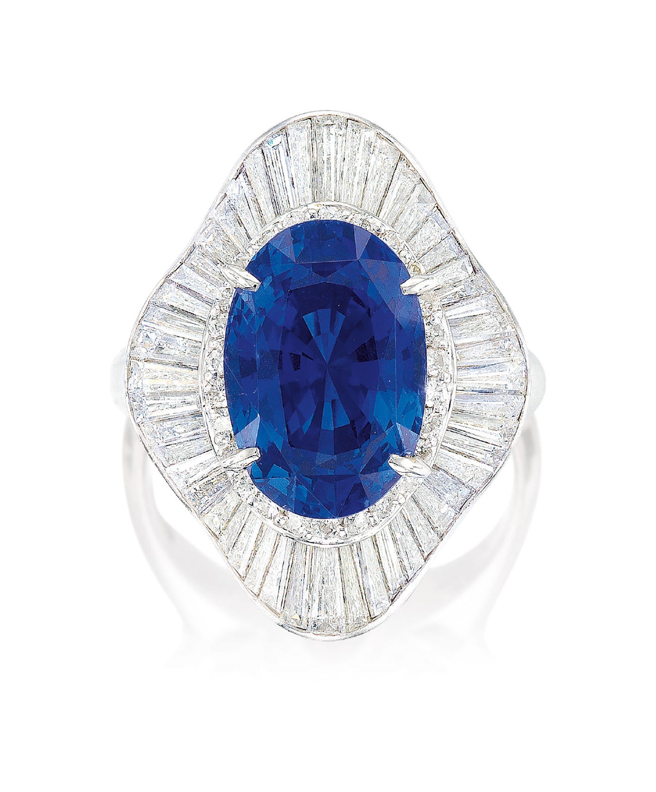 One oval sapphire, 7.51 caratsSurrounded by brilliant-cut and tapered baguette diamonds, totalling approximately 2.45 caratsPlatinum(7.51-carat Sapphire)