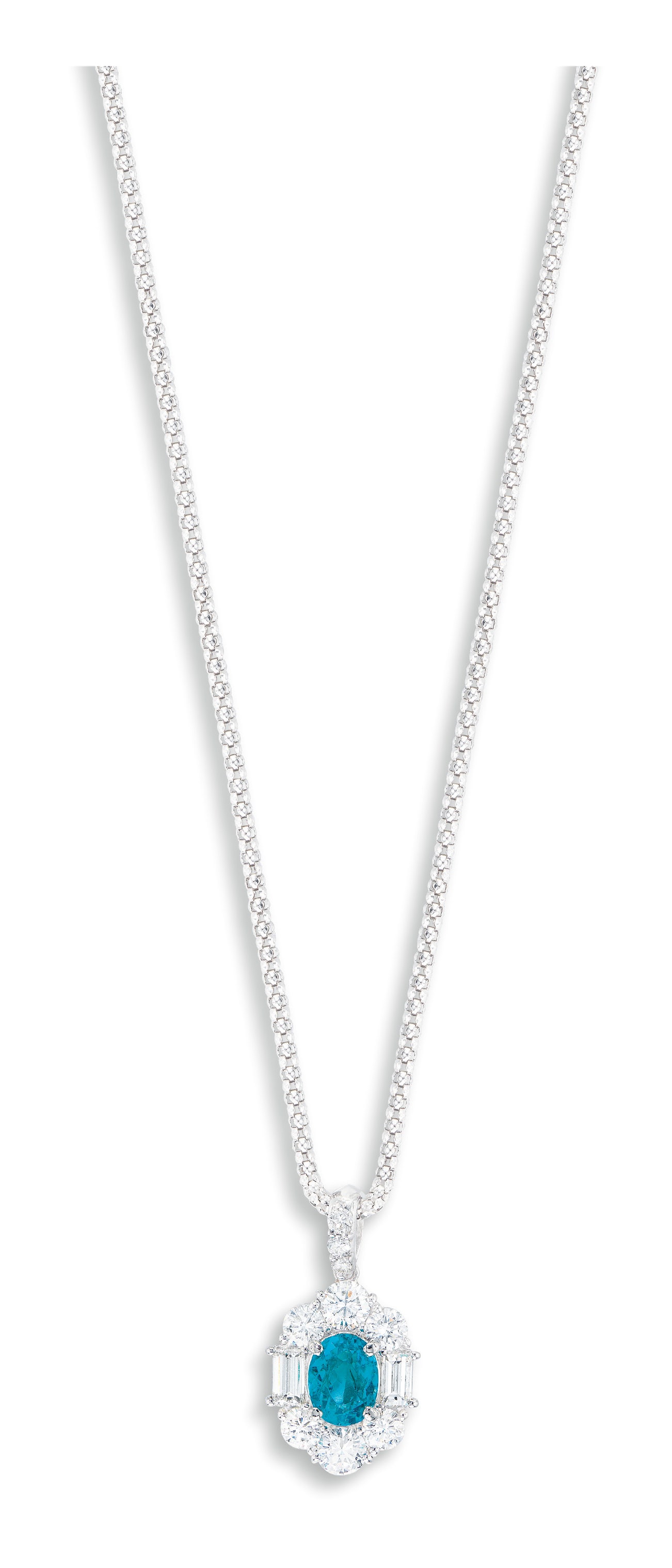 One oval paraíba tourmaline, 1.29 caratsSurrounded by brilliant-cut and baguette diamonds, totalling approximately 1.35 caratsPlatinum(1.29-carat Paraíba Tourmaline)
