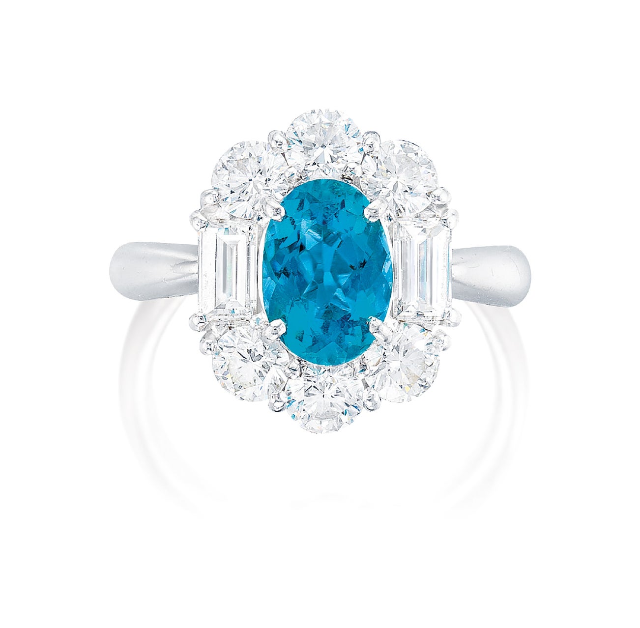 One oval paraíba tourmaline, 1.53 caratsSurrounded by brilliant-cut and baguette diamonds, totalling approximately 1.65 caratsPlatinum(1.53-carat Paraíba Tourmaline)
