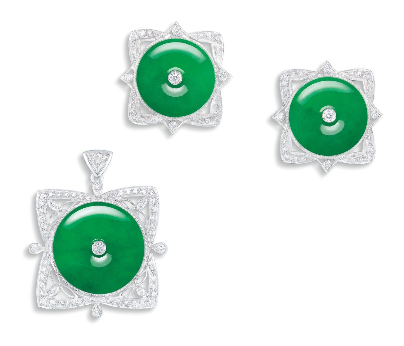 (Pendant) One jadeite <em>huaigu</em>, <em>diameter approximately 21.99mm and thickness approximately 4.55mm</em>; platinum(Ear Clips) Two jadeite <em>huaigu, </em><em>diameter approximately 18.90mm and thickness approximately 4.55mm</em>; 18 karat white goldDecorated with brilliant-cut diamonds, altogether approximately 2.10 carats(Jadeite 'Huaigu')