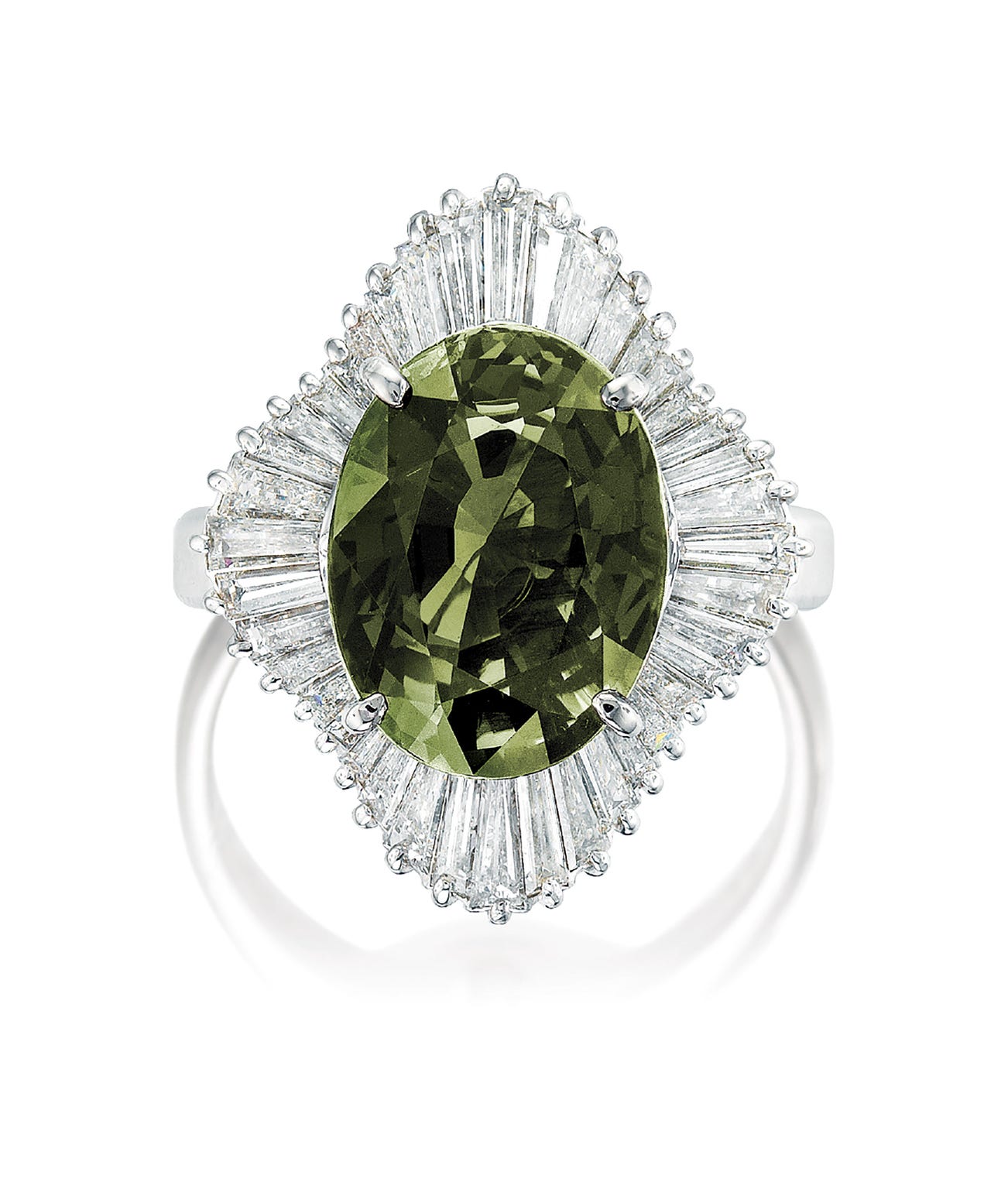 An oval alexandrite chrysoberyl, 7.08 caratsSurrounded by tapered baguette diamonds, totalling approximately 1.65 caratsPlatinum(7.08-carat Alexandrite)