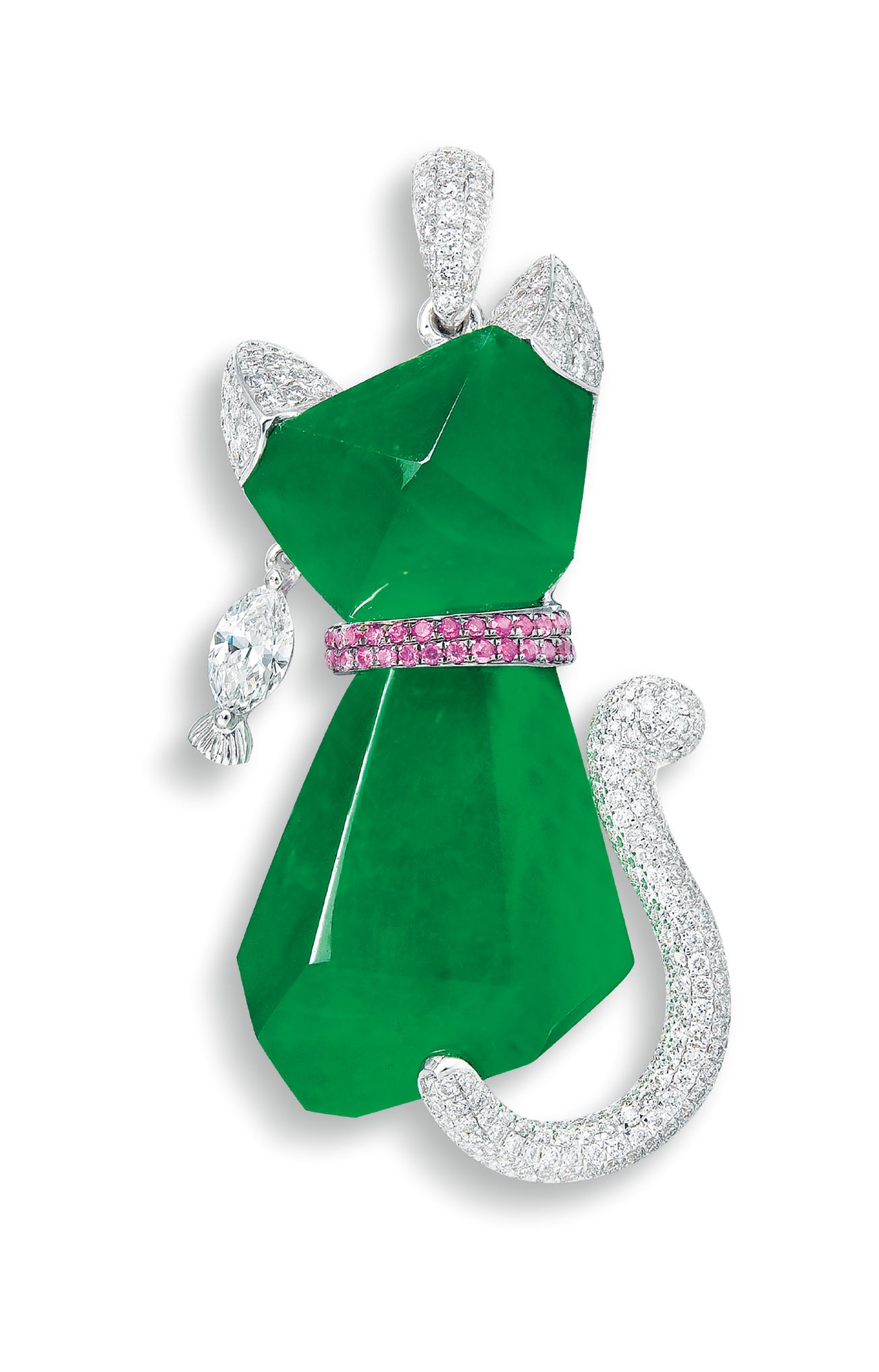A Delightful Jadeite, Pink Sapphire and Diamond 'Cat' Pendant