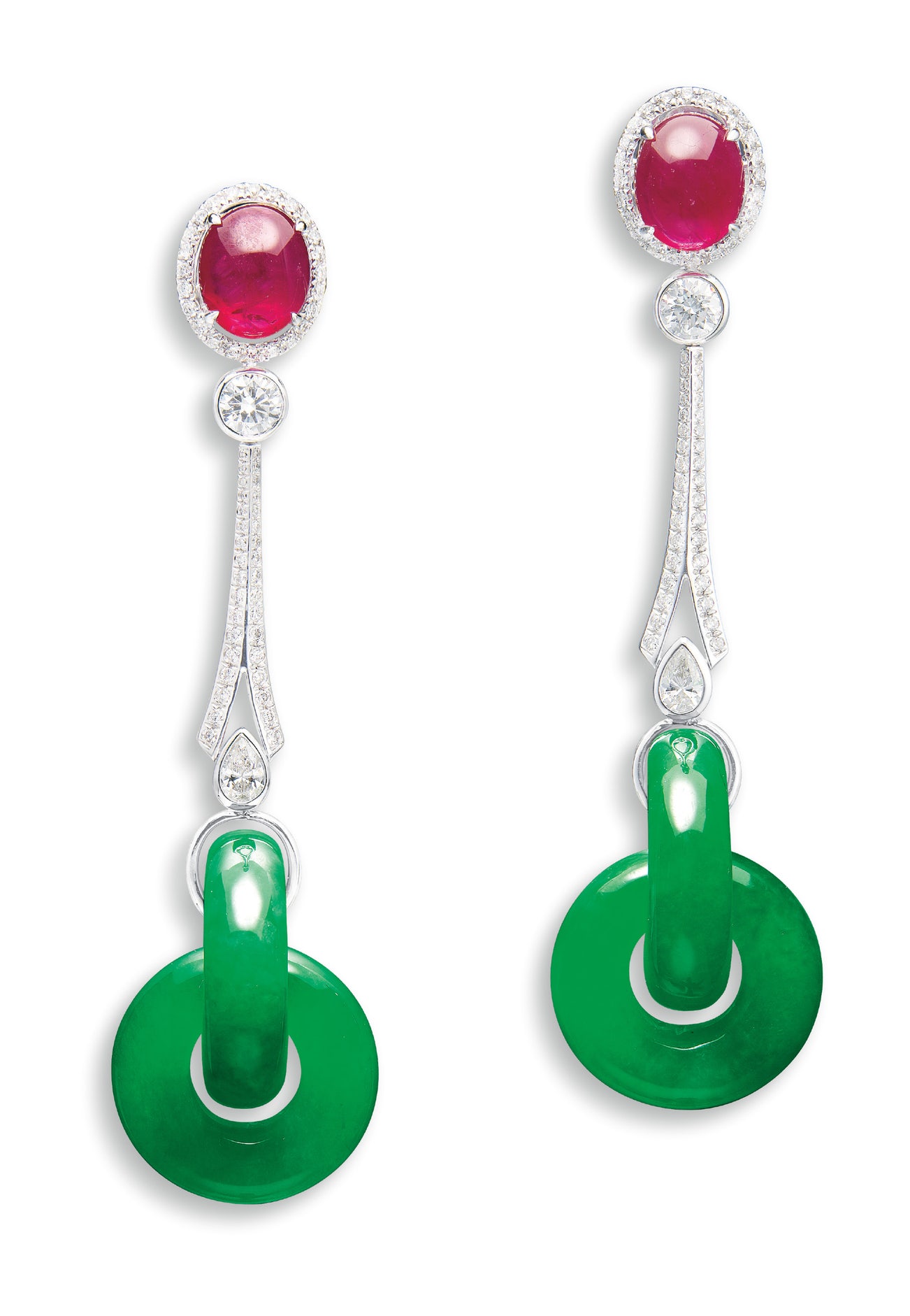 A Pair of Jadeite Double-hoop, Ruby and Diamond Pendent Earrings