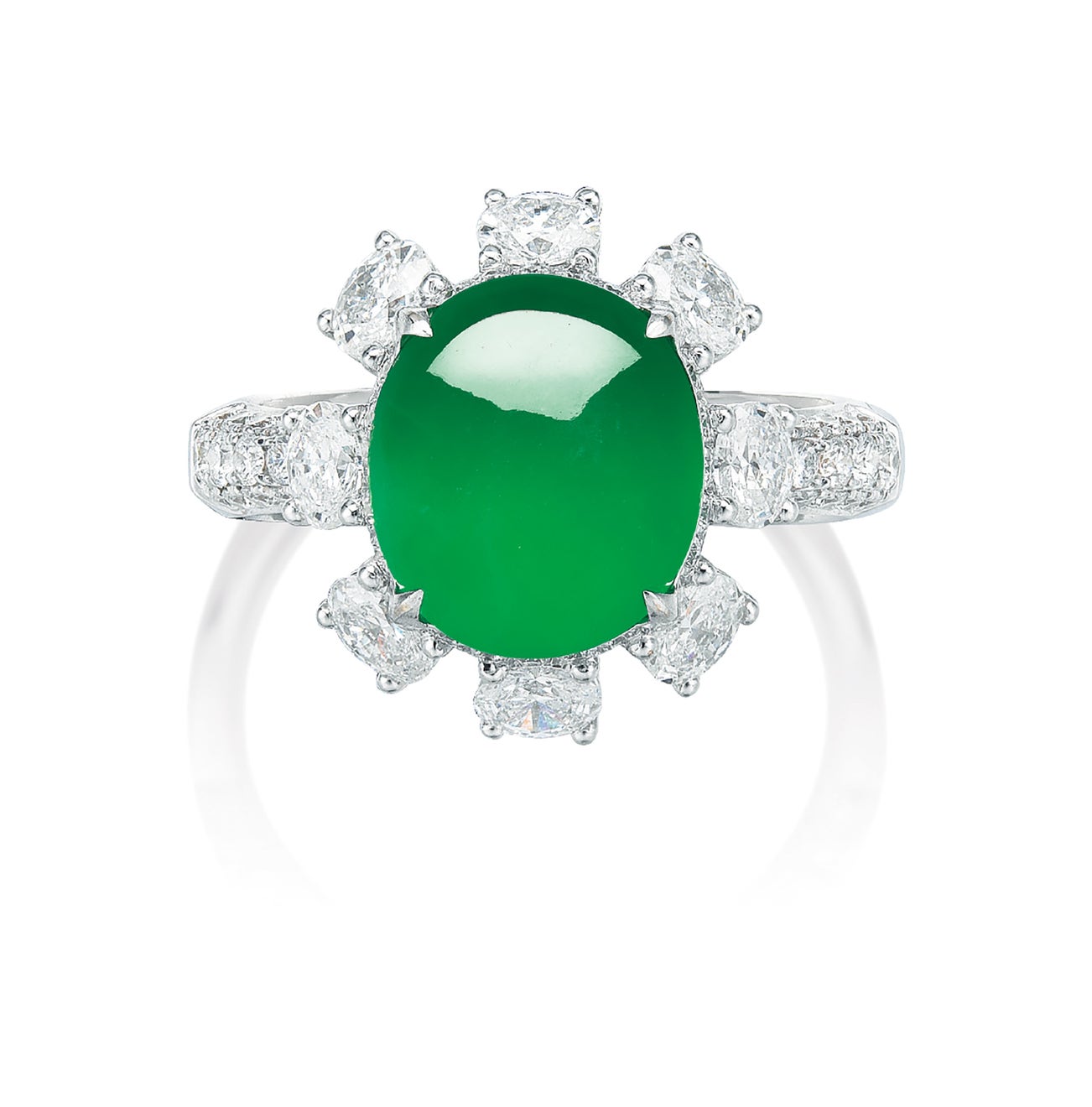 One oval jadeite cabochon, <em>measuring approximately 10.45 x 9.14 x 4.12mm </em>Oval diamonds in the surround and brilliant-cut diamonds on shank, totalling approximately 1.30 carats18 karat white gold(Jadeite Cabochon)