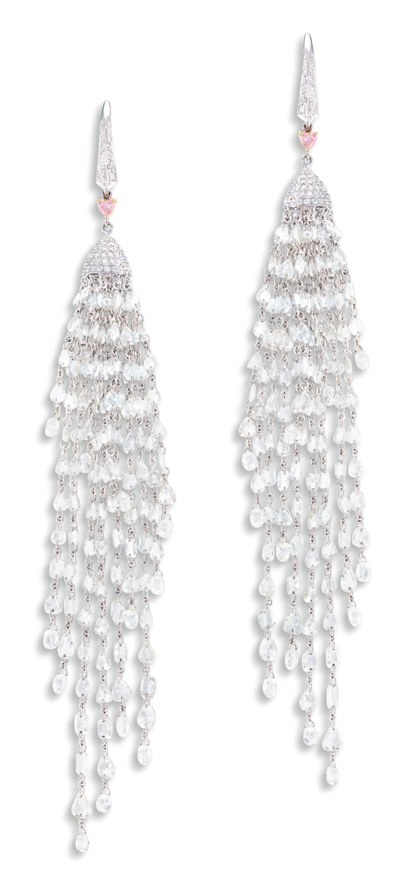 Tassels set with rose-cut and briolette diamonds, surmount and hook set with circular-cut diamonds, totalling approximately 22.90 caratsHighlighted with two heart-shaped pink diamonds18 karat white and pink gold