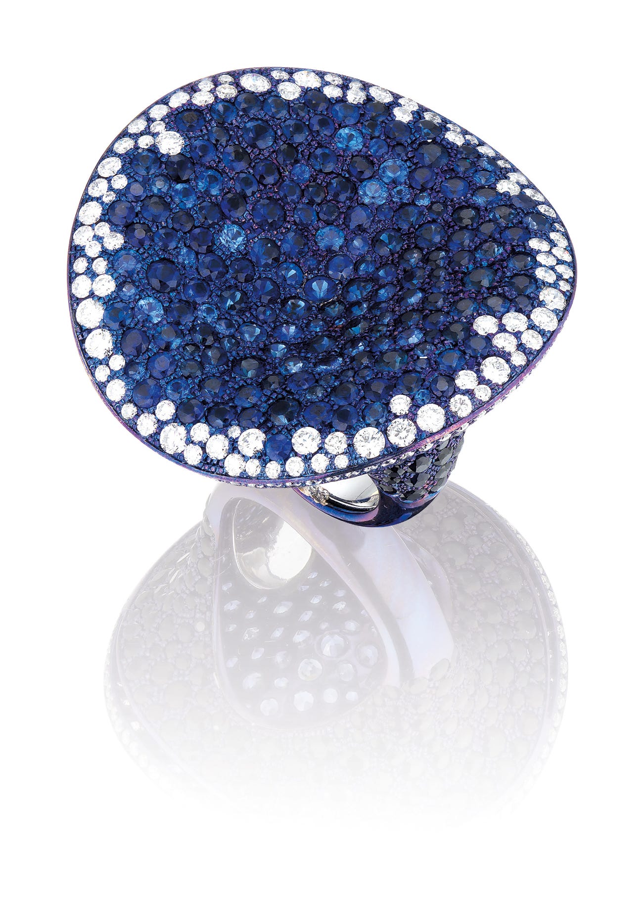 Circular-cut sapphires and black sapphires totalling approximately 16.60 caratsBrilliant-cut diamonds totalling approximately 2.55 caratsTitanium and 18 karat white gold