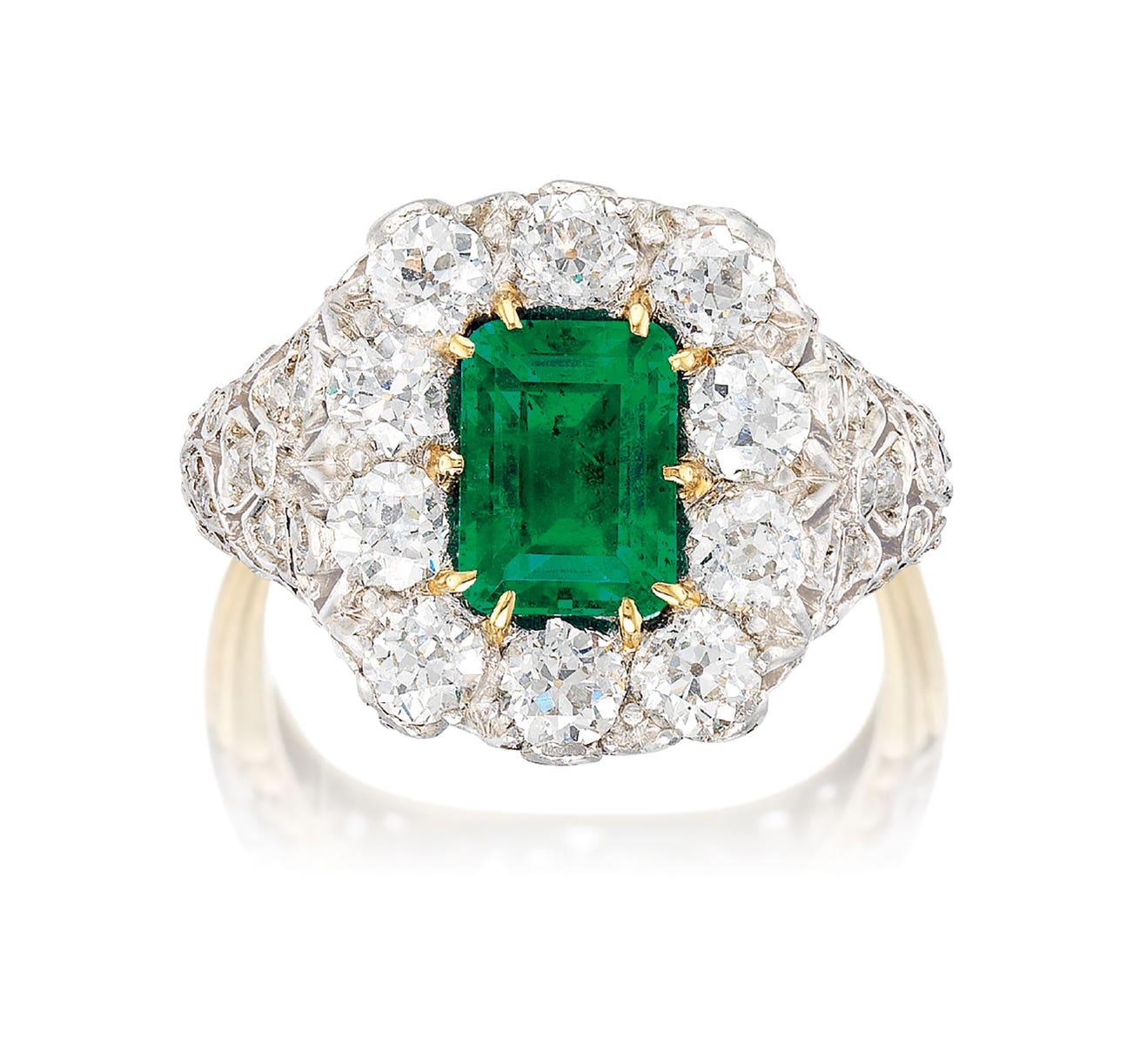 A step-cut emerald, 1.93 caratsOld mine-cut diamonds in the surround and circular-cut diamonds in the gallery, totalling approximately 1.20 caratsPlatinum and 18 karat yellow gold(1.93-carat Emerald)