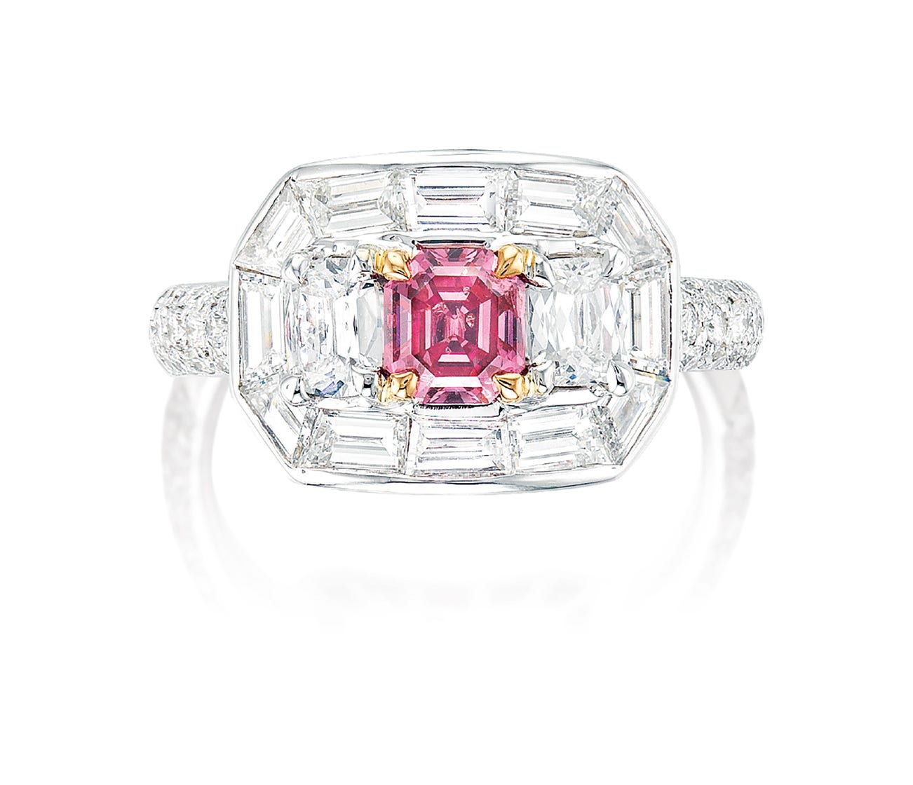 A Fancy Vivid Purplish Pink Diamond and Diamond Ring