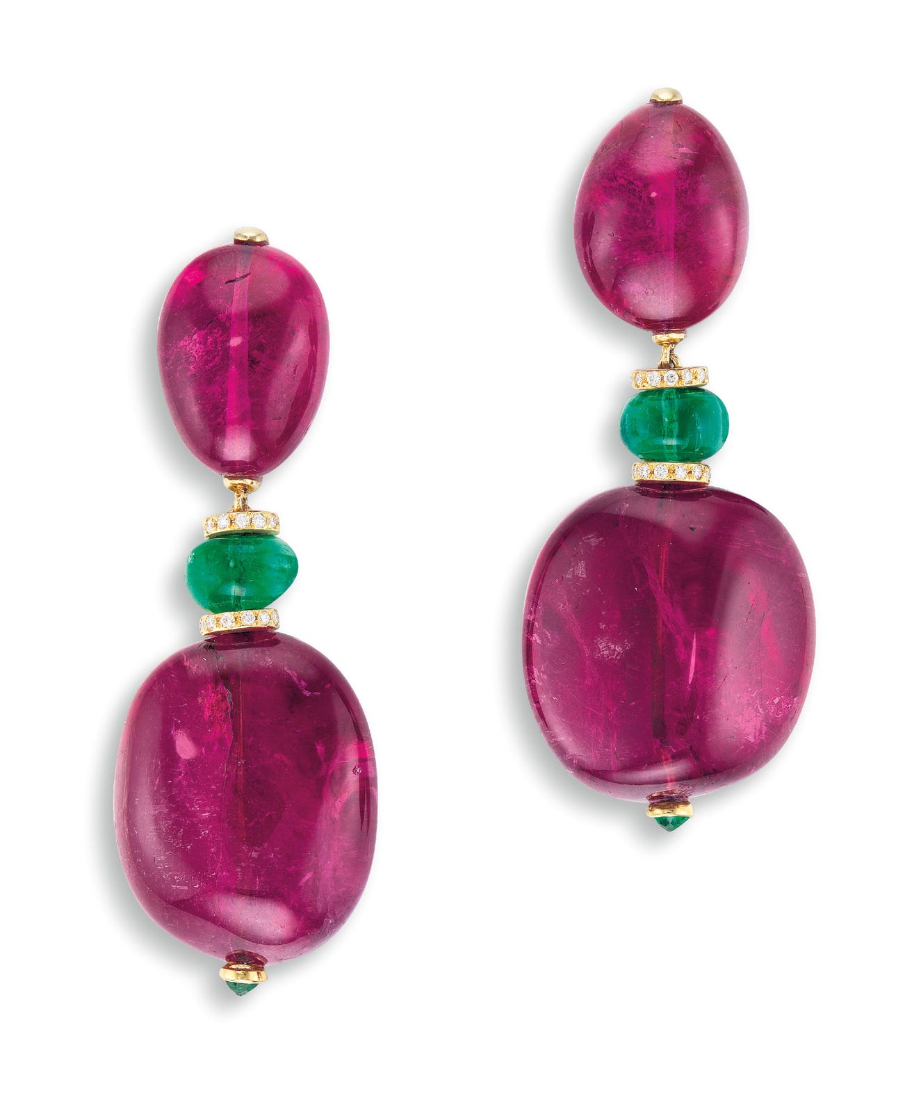 Each set with two pink tourmaline tumbled beads, totalling approximately 83.20 caratsSpaced by an emerald bead, together approximately 3.75 caratsDecorated by tiny diamonds18 karat yellow gold