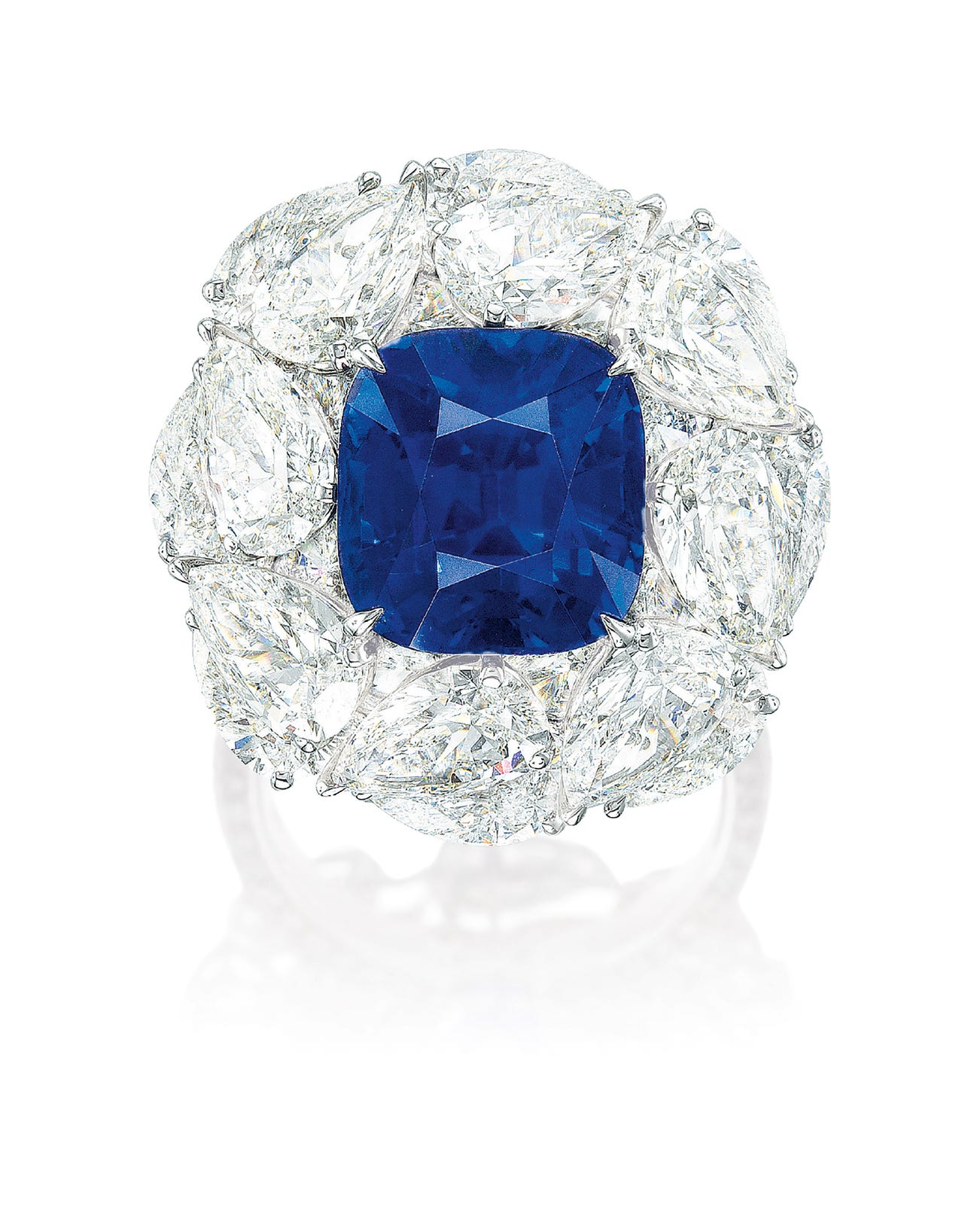 One cushion-shaped sapphire, 9.56 caratsSurrounded by sixteen pear-shaped diamonds, together approximately 12.90 caratsTiny brilliant-cut diamonds on the shank18 karat white gold(9.56-carat Sapphire)