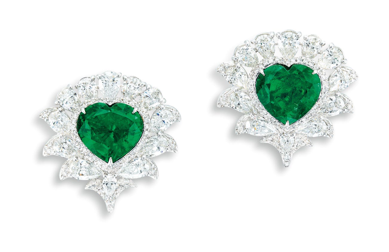 Two heart-shaped emeralds, 4.44 and 4.25 caratsSurrounded by pear, marquise and tiny brilliant-cut diamonds, totalling approximately 6.50 carats18 karat white gold(4.44- and 4.25-carat Emeralds)