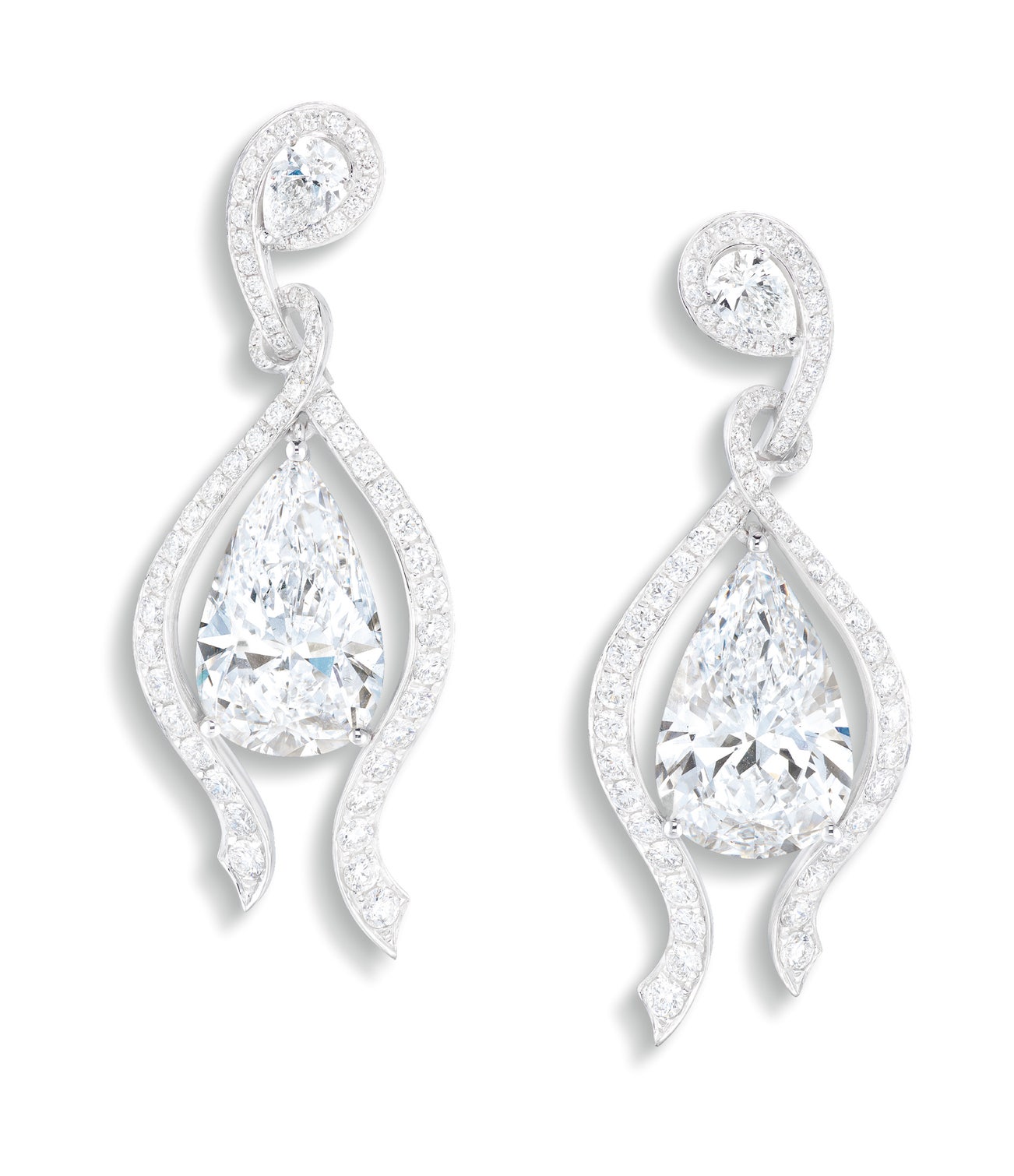 Two pear-shaped diamonds, 5.15 and 5.01 caratsEmbellished with diamond-set ribbons and pear-shaped diamonds in the surmount, together approximately 2.35 carats18 karat white gold(5.15- & 5.01-carat Diamonds)