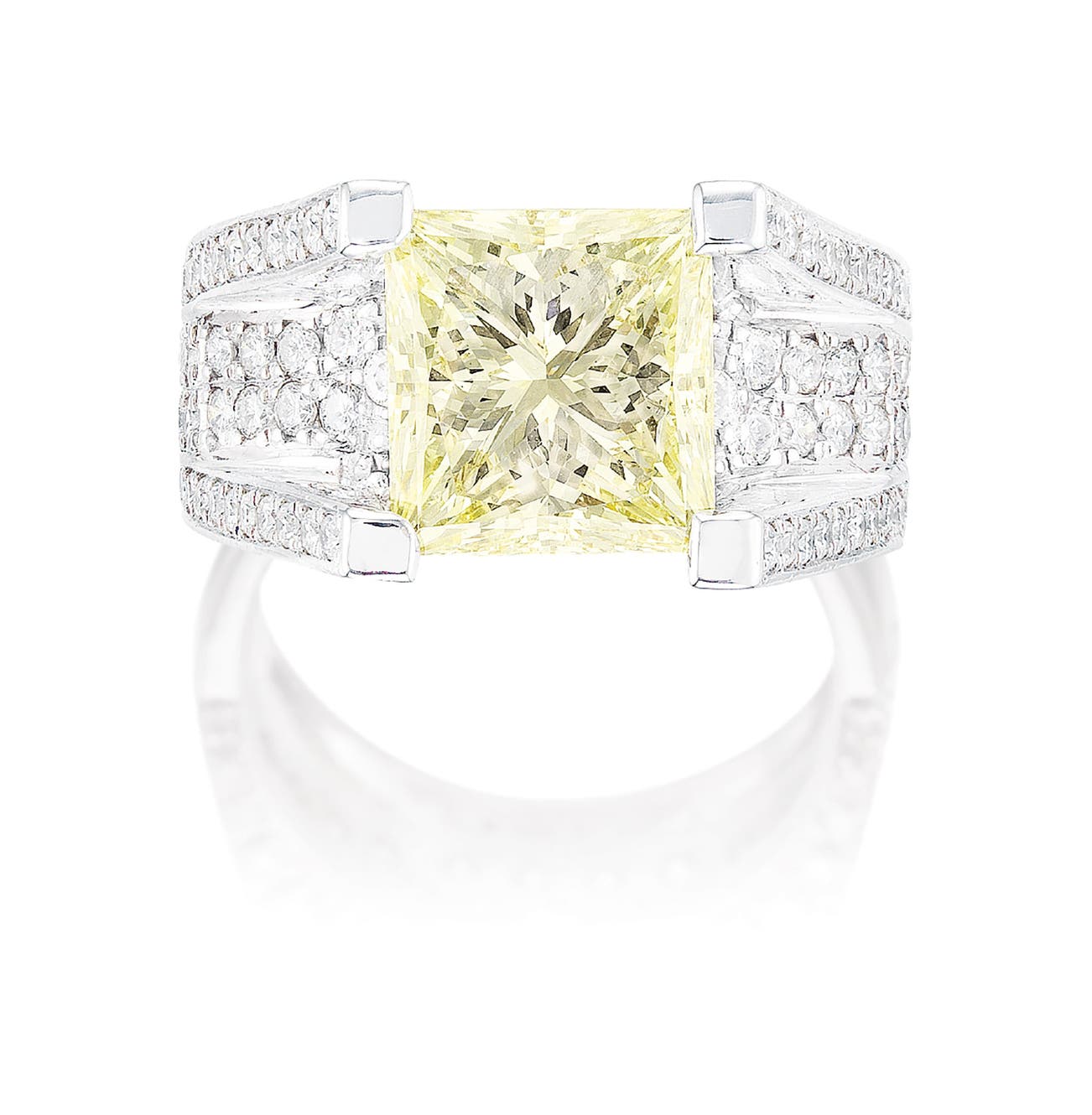 A rectangular modified brilliant-cut diamond, 5.02 caratsGallery and shoulders set with brilliant-cut diamonds, totalling approximately 1.75 carats18 karat white gold(5.02-carat Diamond)
