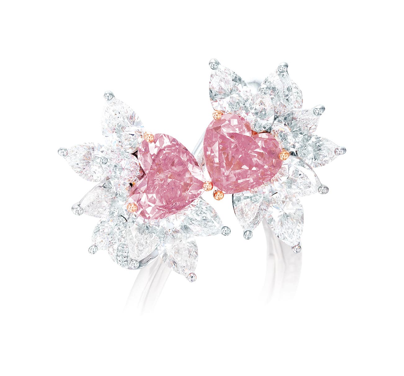 A heart-shaped Fancy Vivid Purplish Pink diamond, 1.01 caratsA heart-shaped Fancy Intense Purplish Pink diamond, 1.02 caratsEach surrounded by seven pear-shaped diamonds, totalling approximately 3.05 caratsTorus and shank set with brilliant-cut diamonds, together approximately 1.00 carat(1.01-carat Pink Diamond)