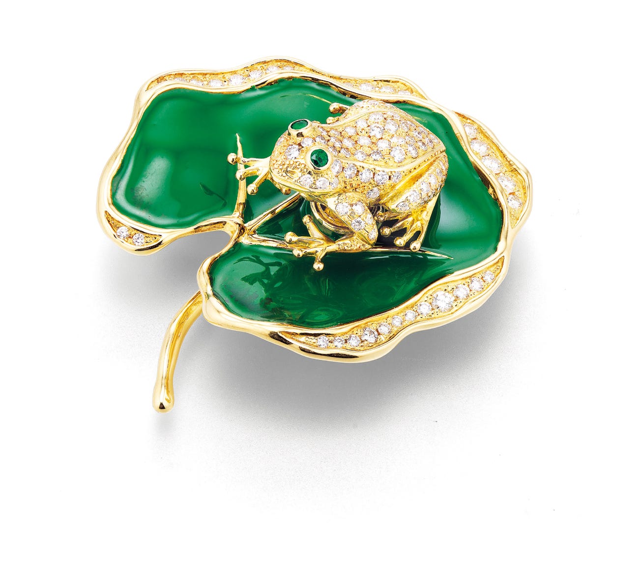 A diamond-set frog resting on a lotus leaf applied with green enamelDiamonds totalling approximately 1.05 carats18 karat yellow gold<em>Frog designed with a revolving mechanism </em><em>With pendant hook fitting</em>