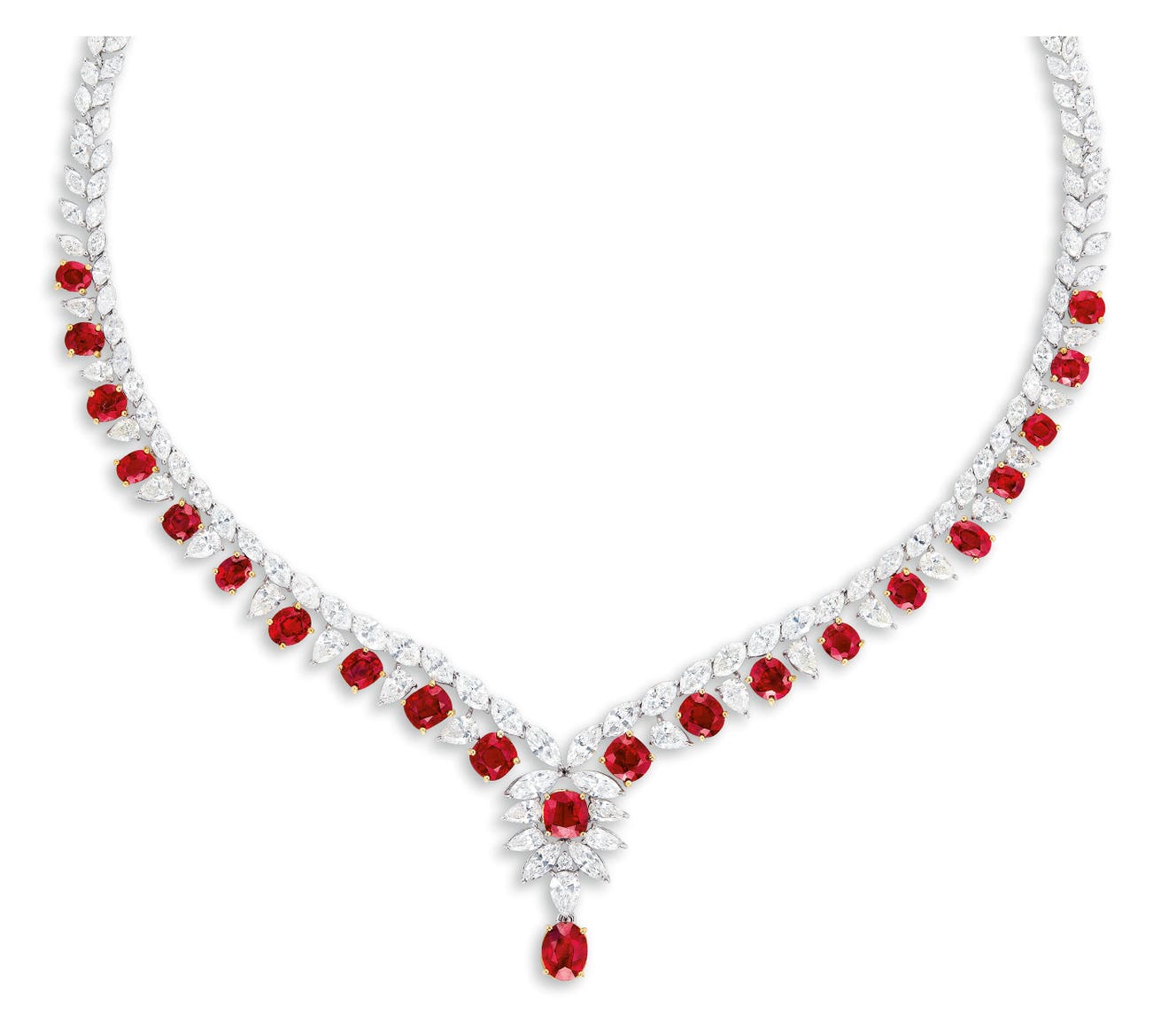 Twenty-two oval and cushion-shaped rubies, together 22.98 caratsEmbellished by pear and marquise-shaped diamonds, totalling approximately 25.00 carats18 karat white and yellow gold(Twenty-two Rubies)