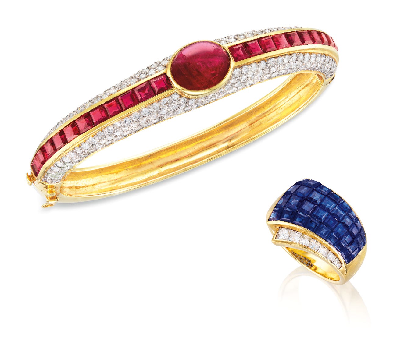 A Ruby and Diamond Bangle; and A Sapphire and Diamond Ring