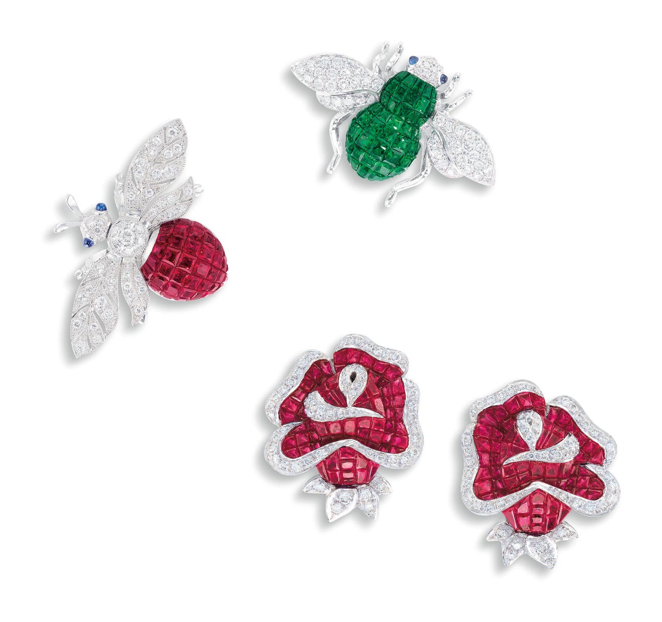 Invisibly-set rubies and circular-cut diamonds, with retractable ear-pins(Two ‘Insect’ Brooches)