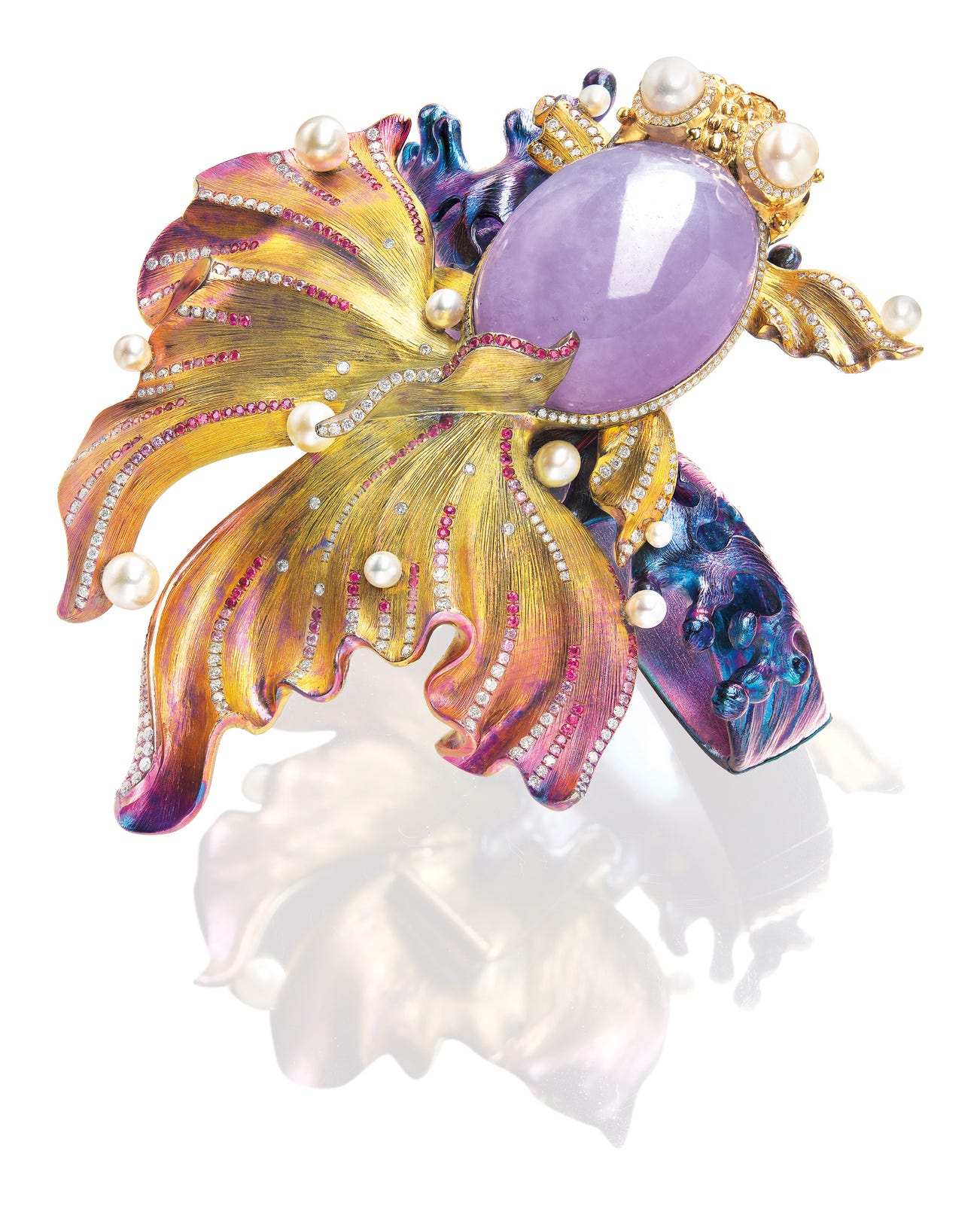 Body set with an oval lavender jadeite cabochon, <em>measuring approximately 25.69 x 21.35 x 9.98mm</em>Highlighted by tiny rubies and brilliant-cut diamonds, with cultured pearl 'bubbles'Titanium and 18 karat rose gold<em>With pendant and brooch fittings, convertible to bangle</em>(Lavender Jadeite Cabochon)