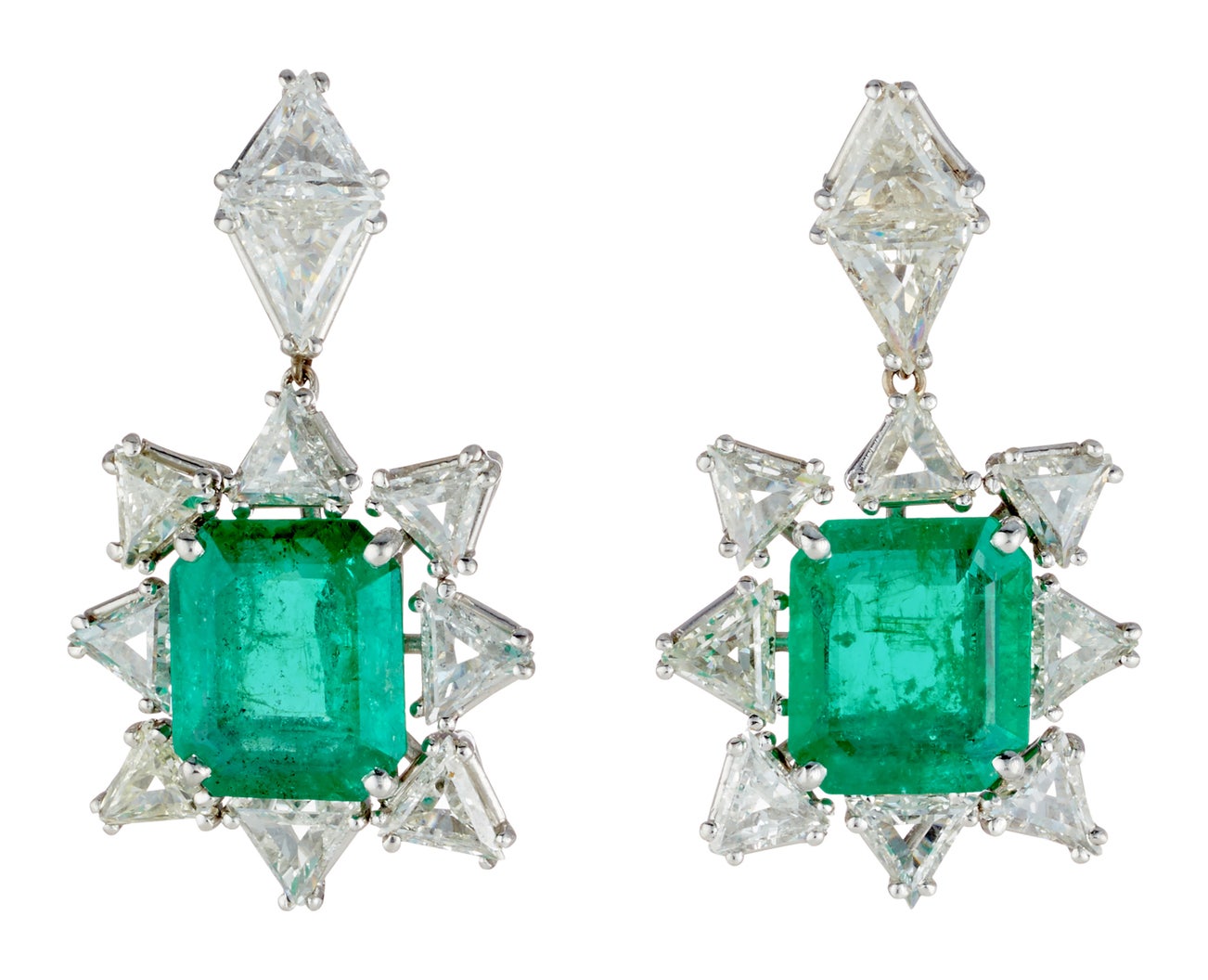 A Pair of Emerald, Diamond and Platinum Earrings