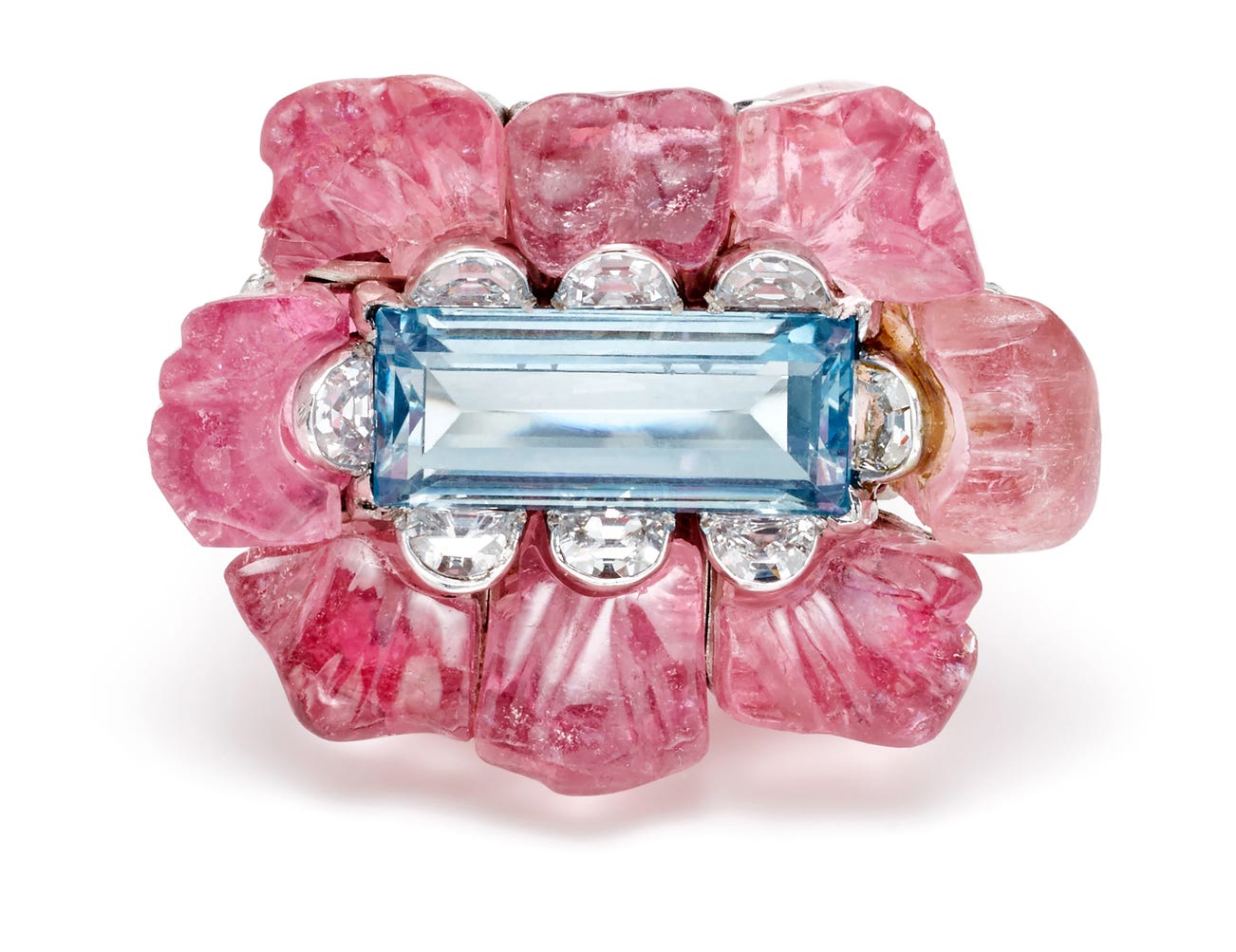 Carved tourmaline and half-moon-shaped diamonds