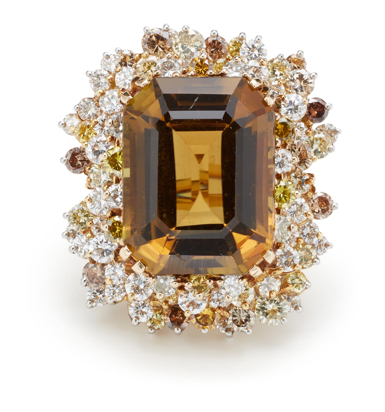 A Tourmaline, Diamond, Colored Diamond, Platinum and Gold Ring