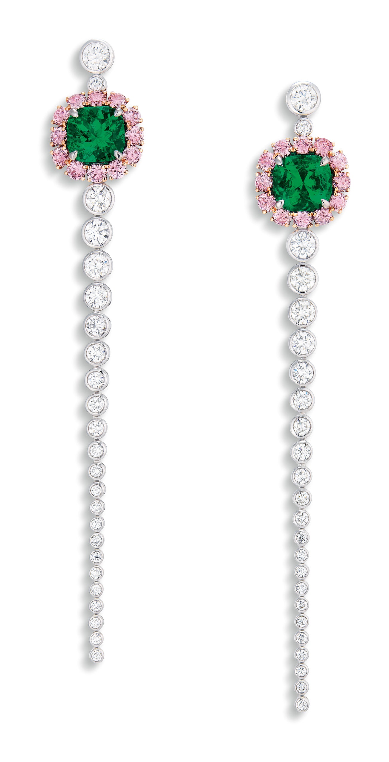 Each set with a cushion-shaped emerald, 1.81 and 1.69 carats respectivelySurrounded by brilliant-cut pink diamonds, totalling approximately 1.70 caratsSuspending collet-set diamond links, diamonds altogether approximately 3.10 carats18 karat pink and white gold<em>With a signed lacquer box from Muzo Emerald Colombia and The Green Jewel Encore Collection book </em>(1.69-carat Emerald)