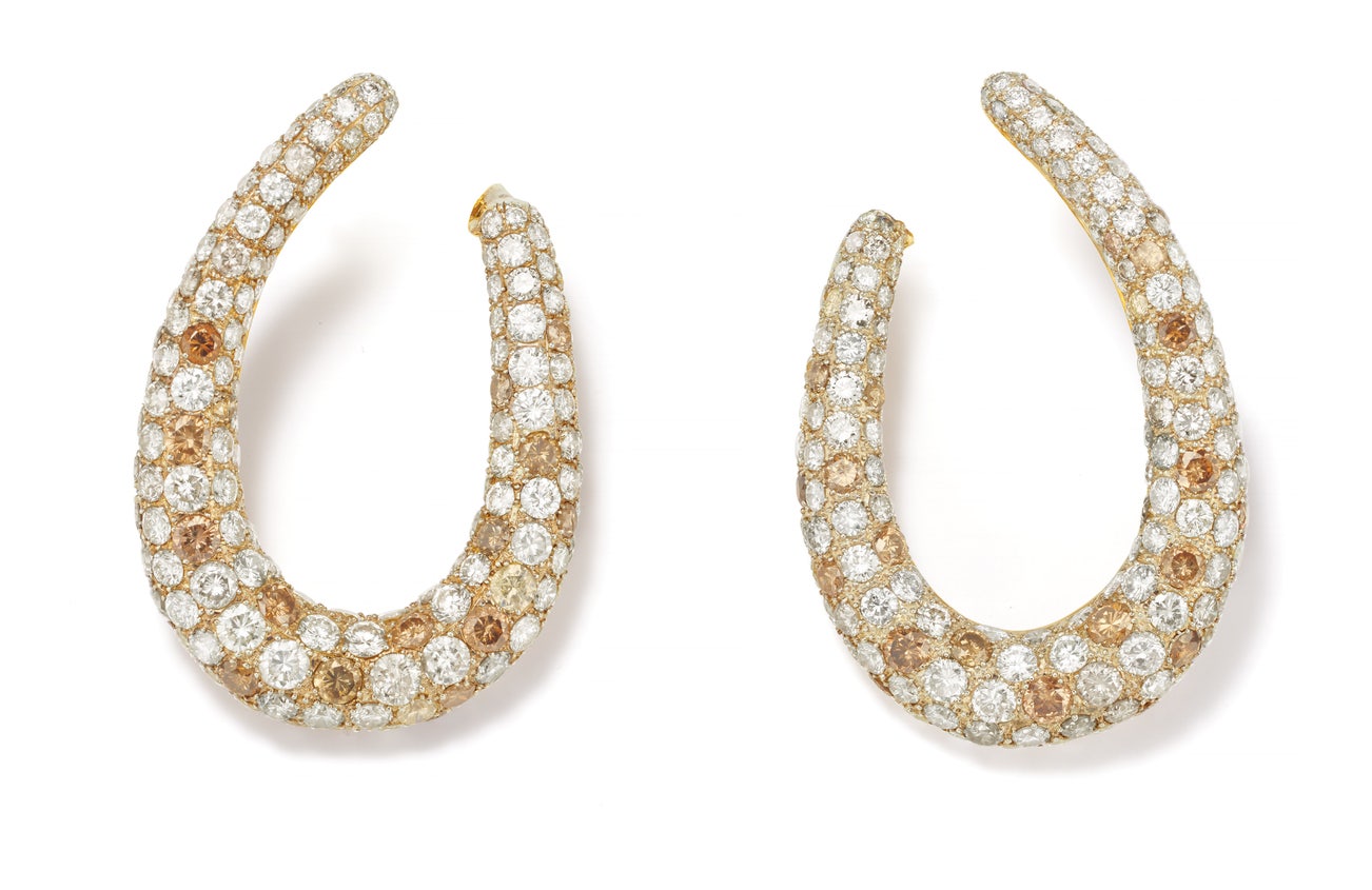 A Pair of Diamond, Colored Diamond and Gold Earrings