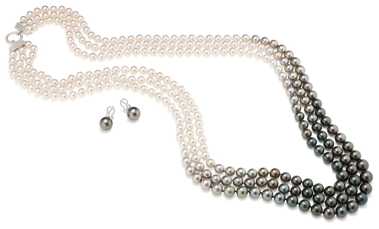 An Akoya and Tahitian Cultured Pearl, Diamond and Gold Necklace and Pair of Earrings