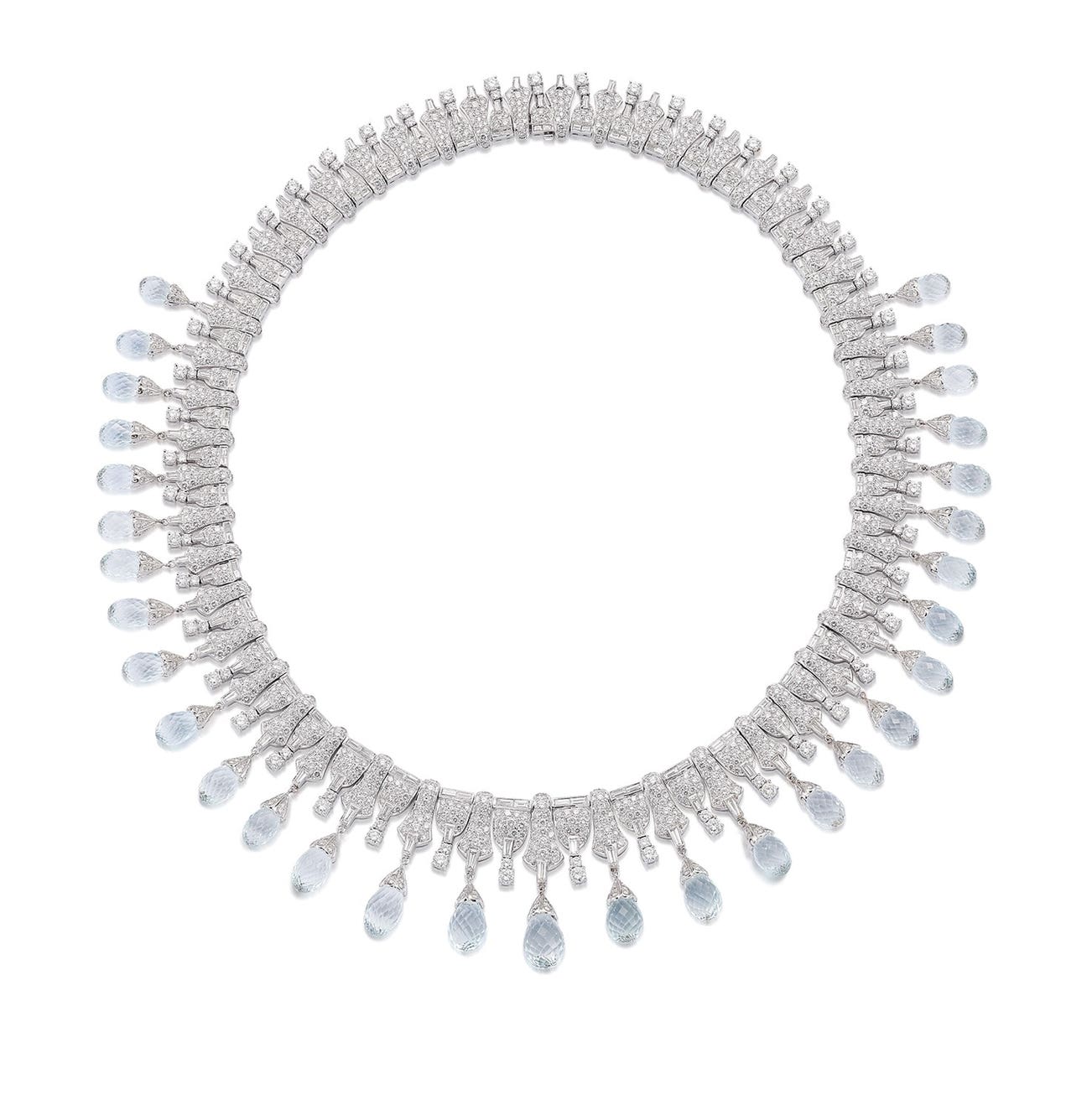 Thirty-one aquamarine briolettes, approximately 77.88 carats totalRound brilliant-, tapered baguette and baguette-cut diamonds, approximately 28.93 carats total,18K white gold