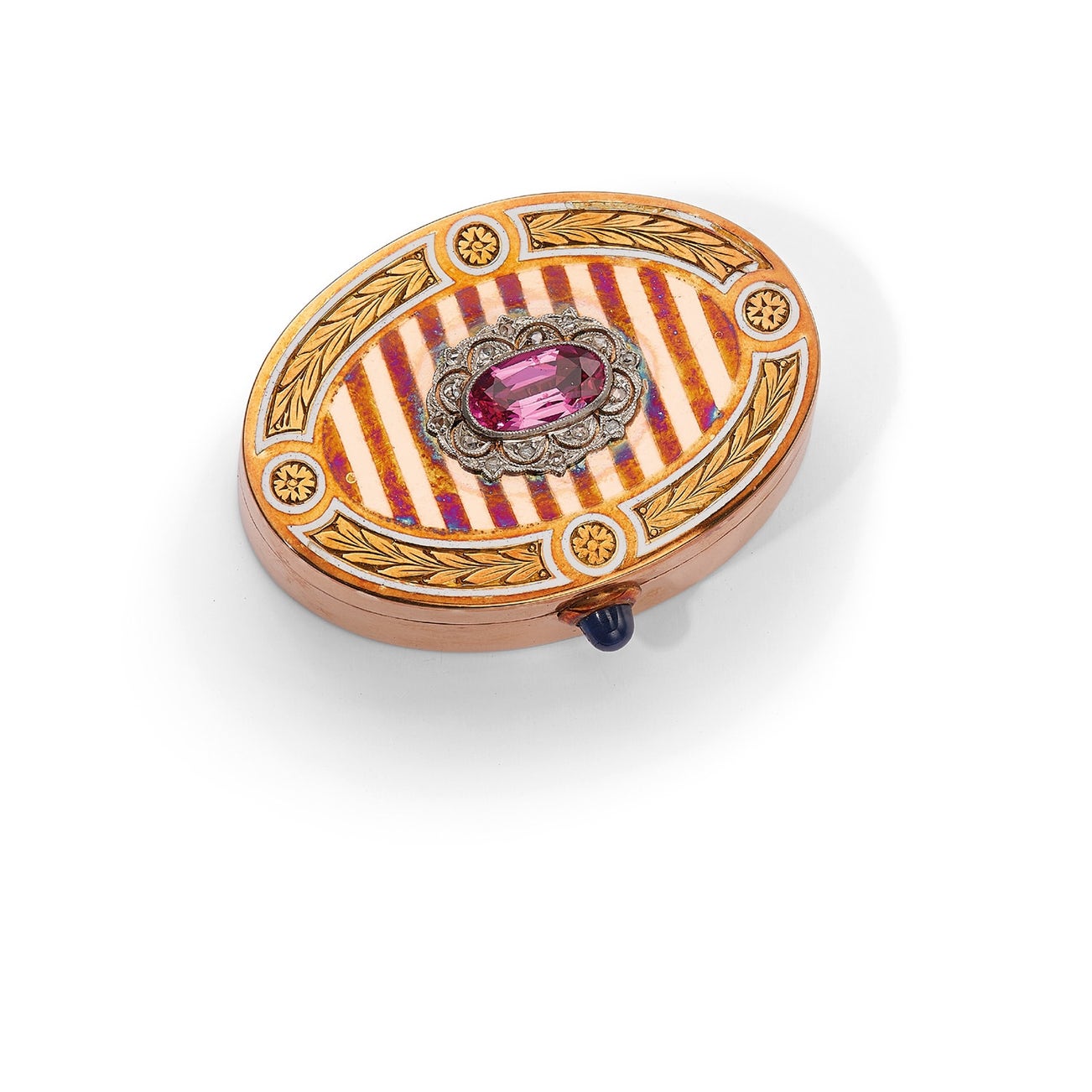 A Pink Spinel, Diamond, Enamel and Sapphire Pill Box, Circa 1910