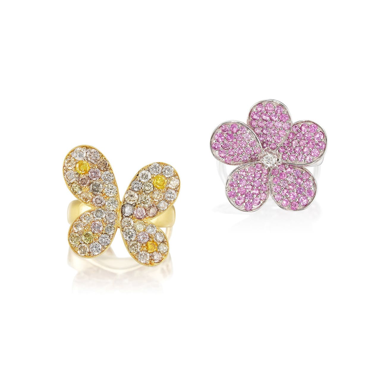 A Pink Sapphire and Diamond 'Flower' Ring, and A Coloured Diamond and Diamond 'Butterfly' Ring
