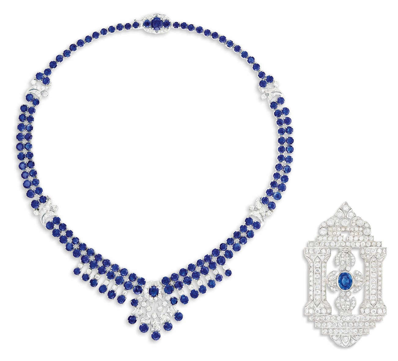 A Sapphire and Diamond Necklace; and A Sapphire and Diamond Brooch