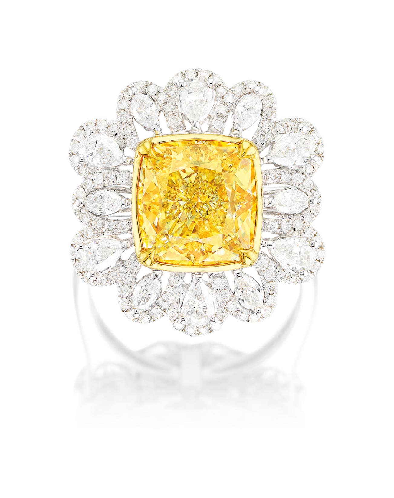 One cushion-shaped Fancy Yellow diamond, 5.01 caratsBrilliant-cut and pear-shaped diamonds in the surround and on spectacle-set chain18 karat white and yellow gold(5.01-carat Diamond)