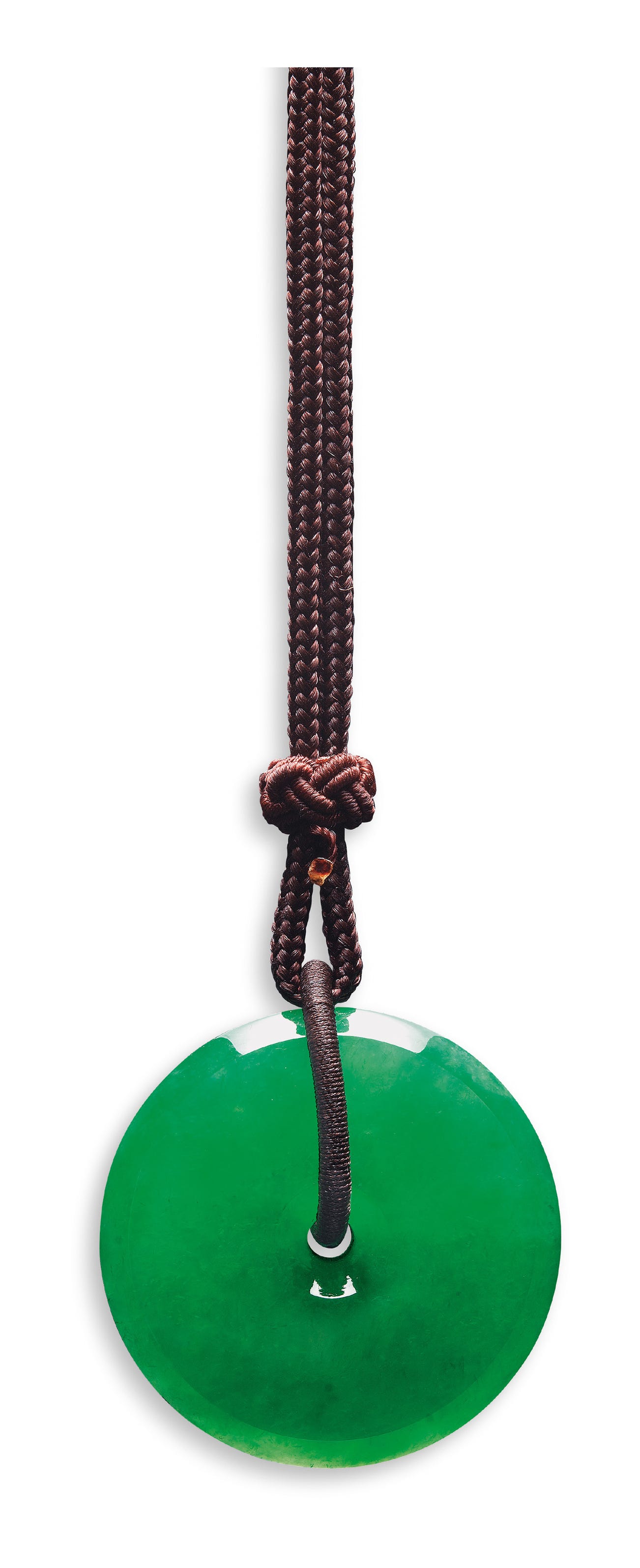 Diameter approximately 34.51 to 34.55mmThickness approximately 8.93mmCompleted on a rope necklace, length approximately 525mm to 605mm(Jadeite 'Bi')